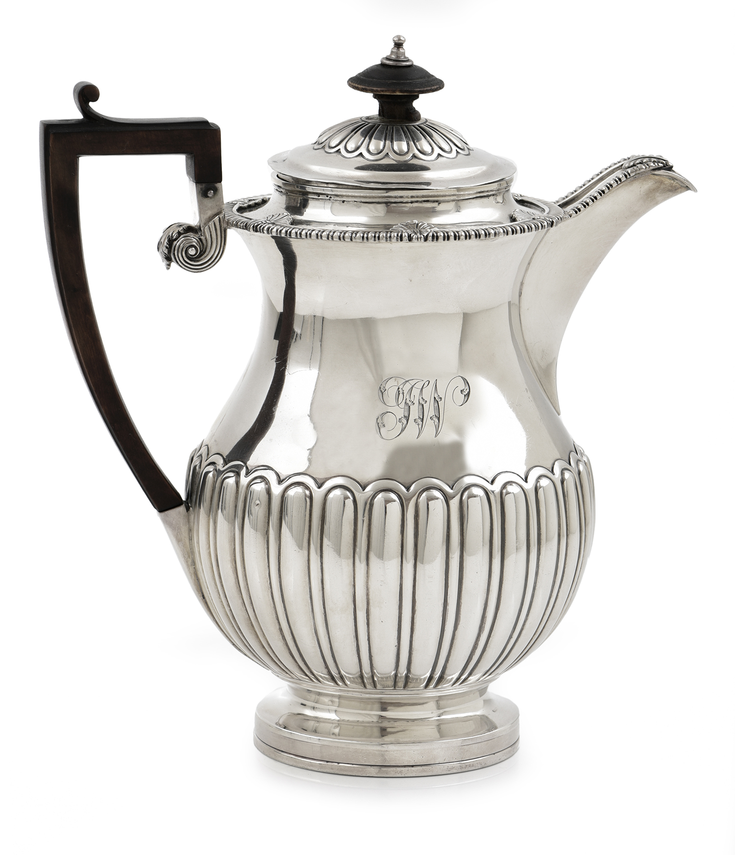 baluster, with fluted decoration to the domed lid and the lower body, wooden handle, total weight approximately 744gms, 23cm high