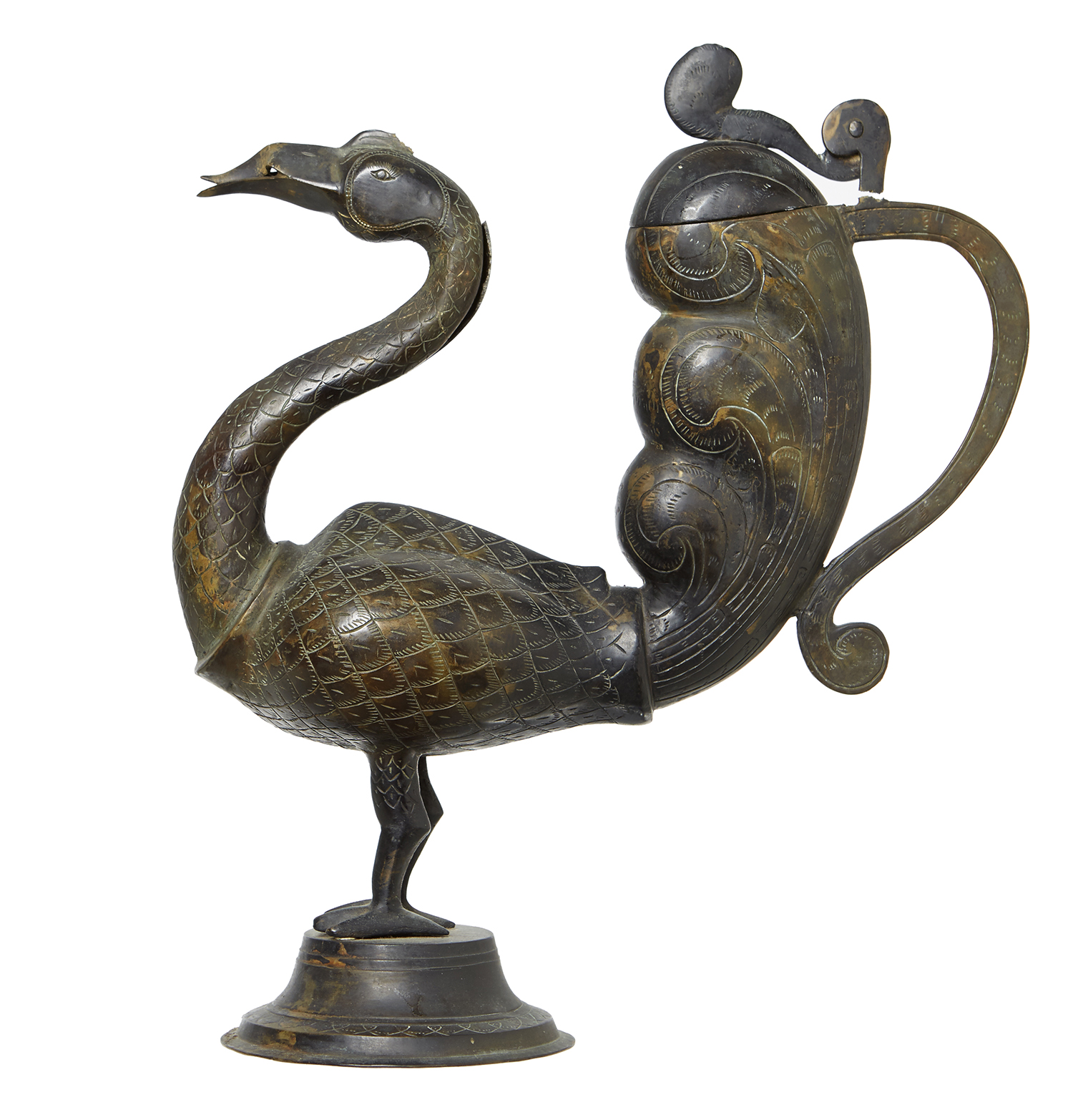 Depicted with flourishing tail feathers and engraved thoughout, remnants of gilding, 36cm high