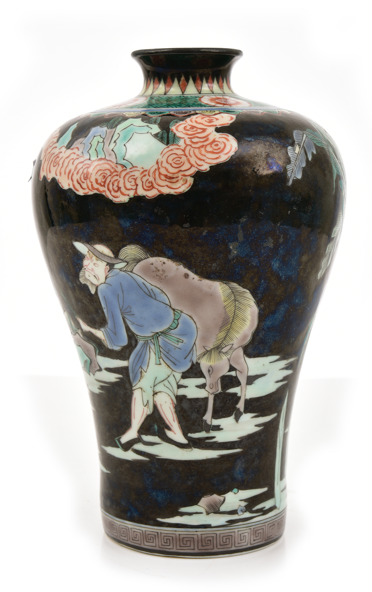 meiping in form, with an enamelled mythological scene, blue underglazed six character mark to base, 23cm high