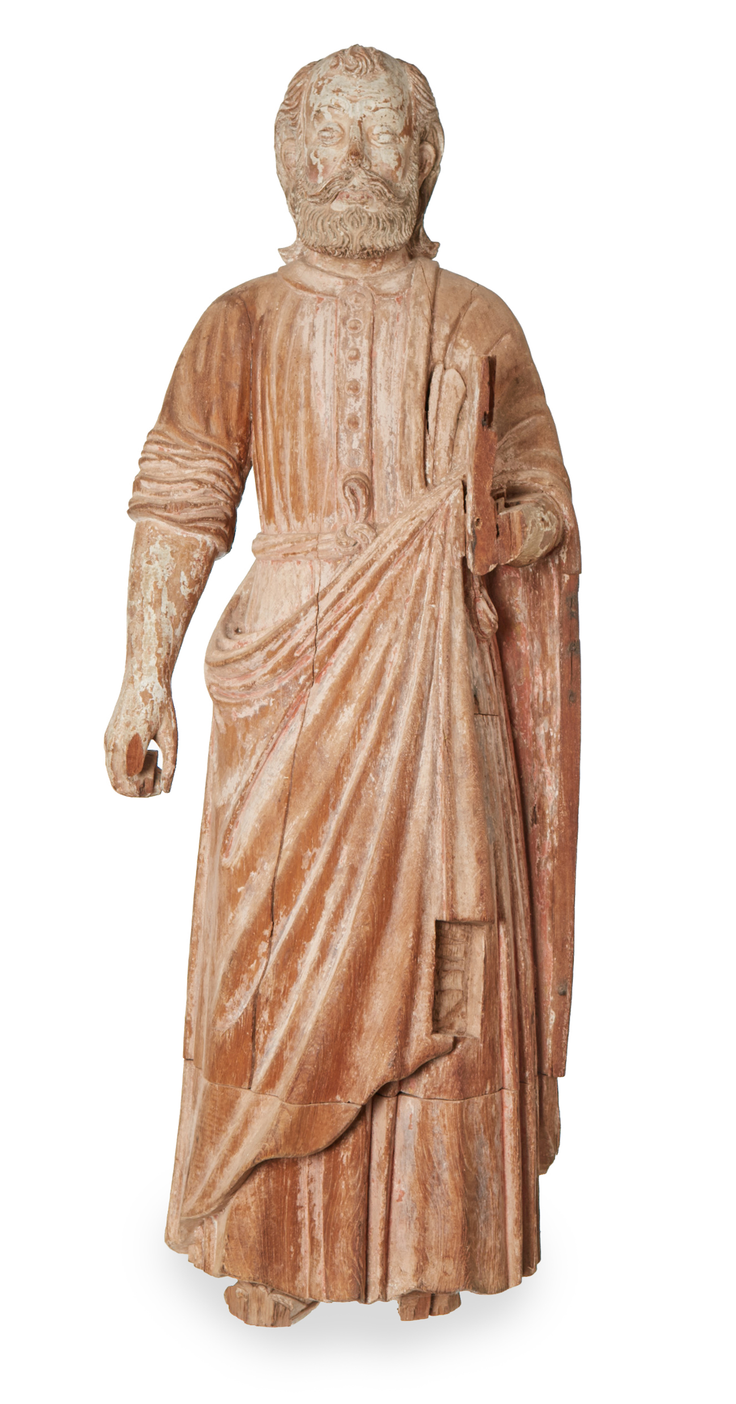 Depicted in robes holding the book in one arm and possibly keys in the other (now with loss), 105cm high