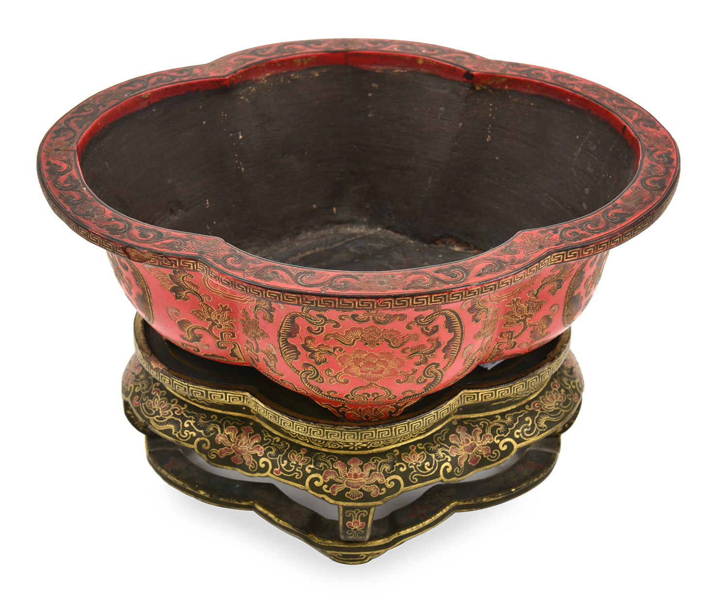 the quatrefoil shaped shallow wooden bowl, with heavily applied red lacquer to exterior of bowl, with an incised and gilded floral motif, supported by four feet, seated on matching gilded and floral decorated black lacquered quatrefoil stand, the bowl 9 x 26cm , the base 7.5 x 19cm