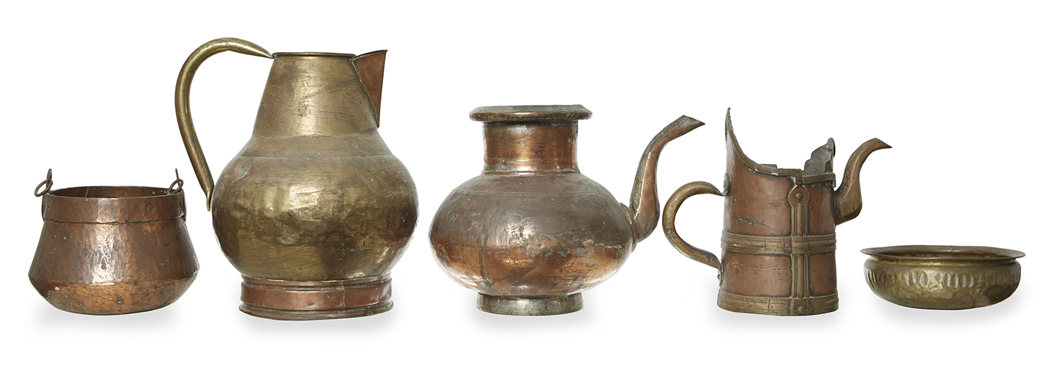 Comprising three ewers, a cauldron and a bowl, tallest 35cm high (5)