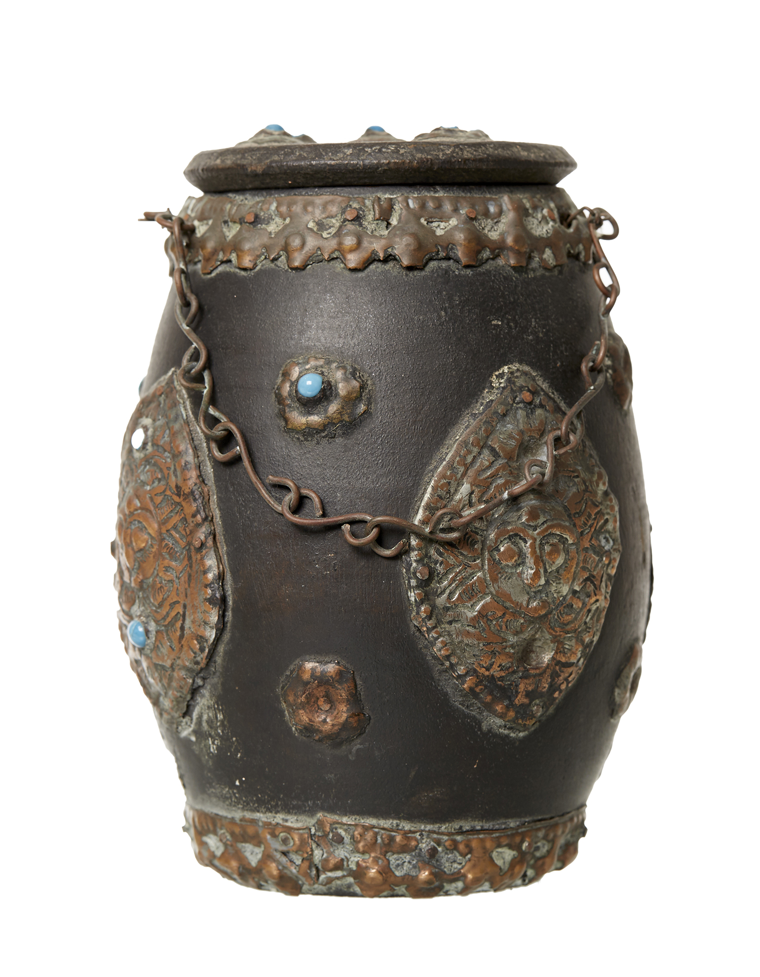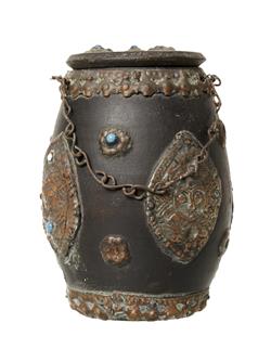 With embossed brass alloy mounts and inset turquoise stones, 15.5cm high, together with hand potted candle lamp (2)
