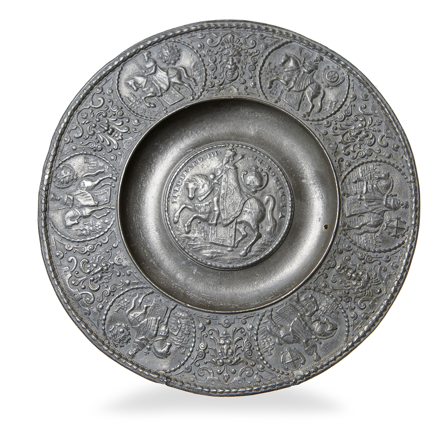 Cast with central roundel depicting Ferdinand III and the six electors of Saxony to the rim, makers emblem to the centre, 19cm diameter