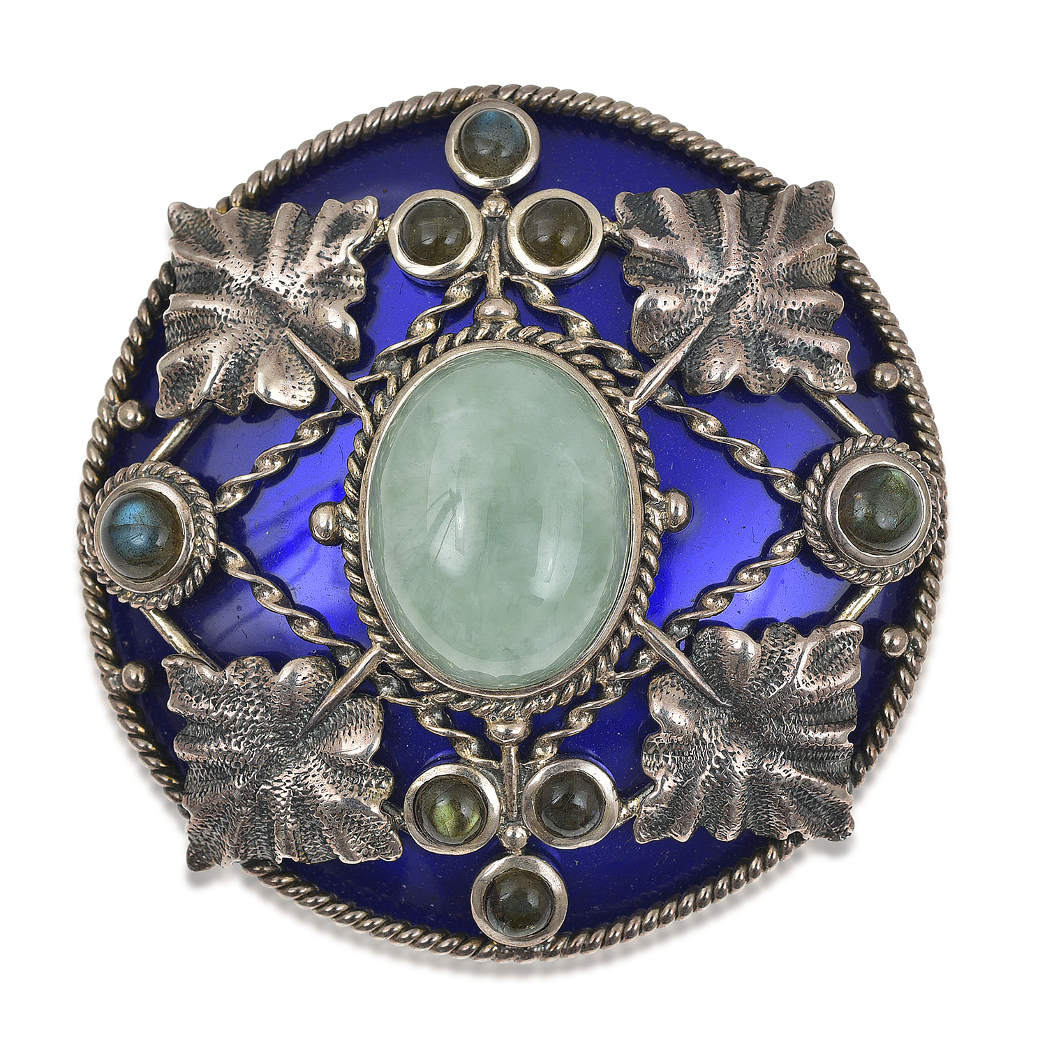 The circular blue enamel brooch, with applied foliate silver decoration, centrally set with an oval green jadeite cut en cabochon and labradorite to the surround, in sterling silver, signed.