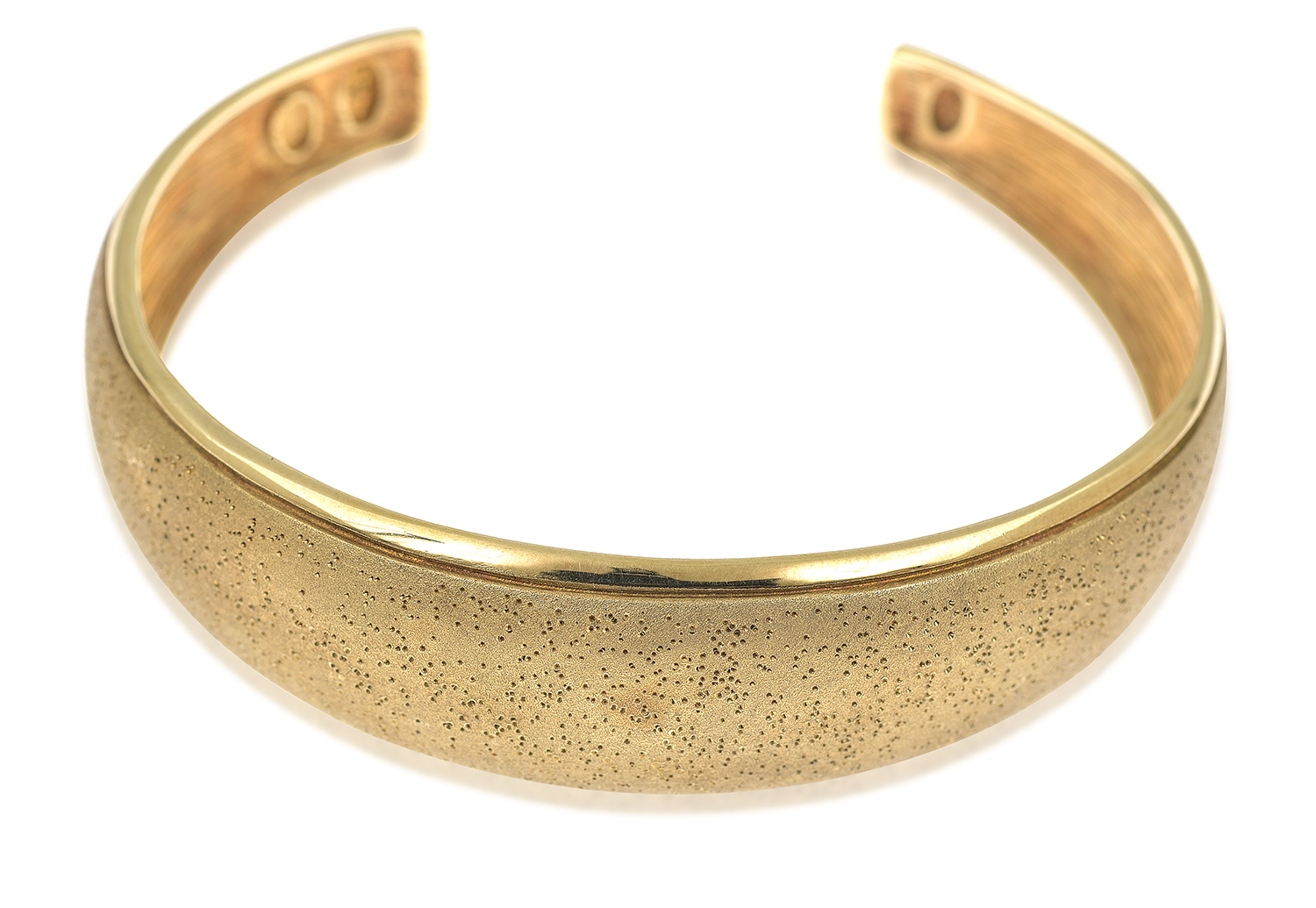 The oval convex open bangle with polished and florentine finish, width 600mm.