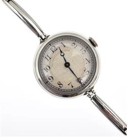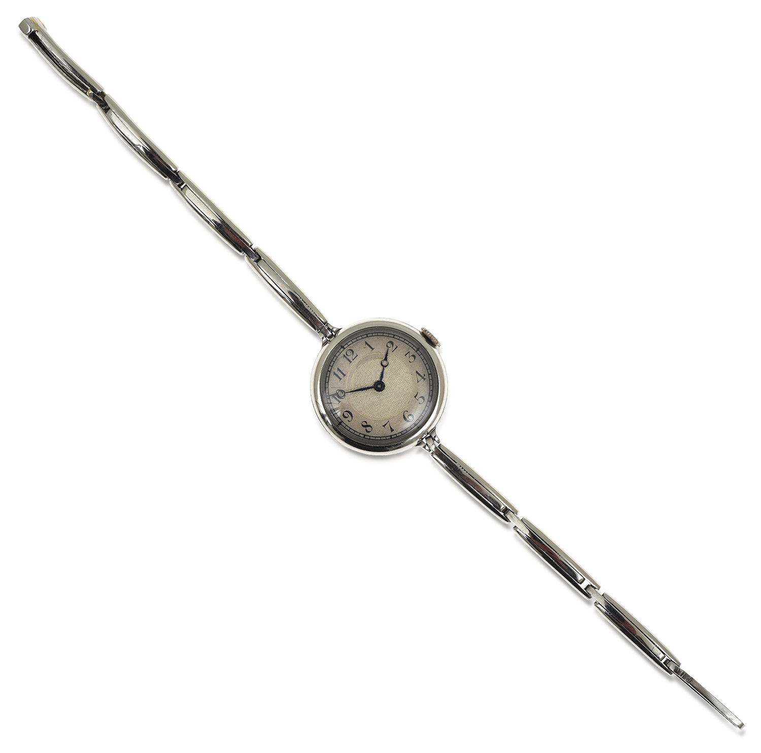 Manual wind movement, circular textured silvered dial with black Arabic numerals, platinum case and 9ct white gold expandable bands, total length 150mm, 20mm diameter, circa 1914.