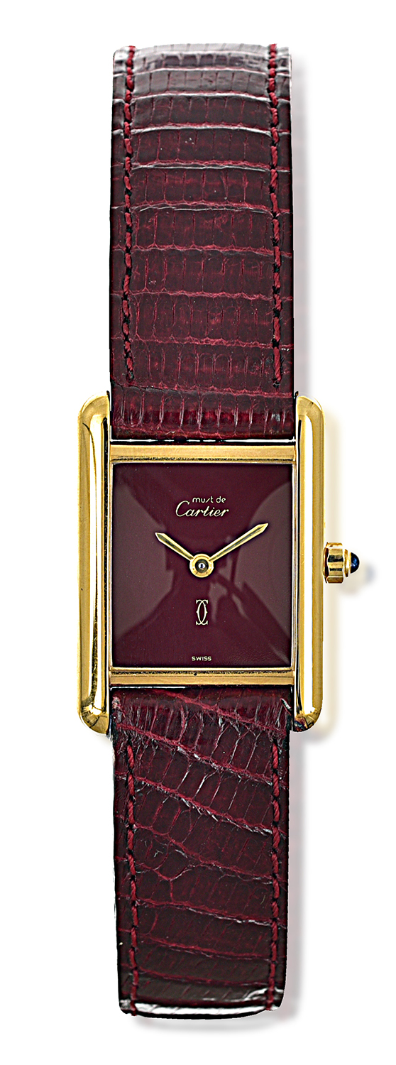 Quartz movement, rectangular maroon dial, signed case, dial and movement, vermeil case with original maroon leather bands, case reference 3 8801 17679, case length 20mm, with original box.