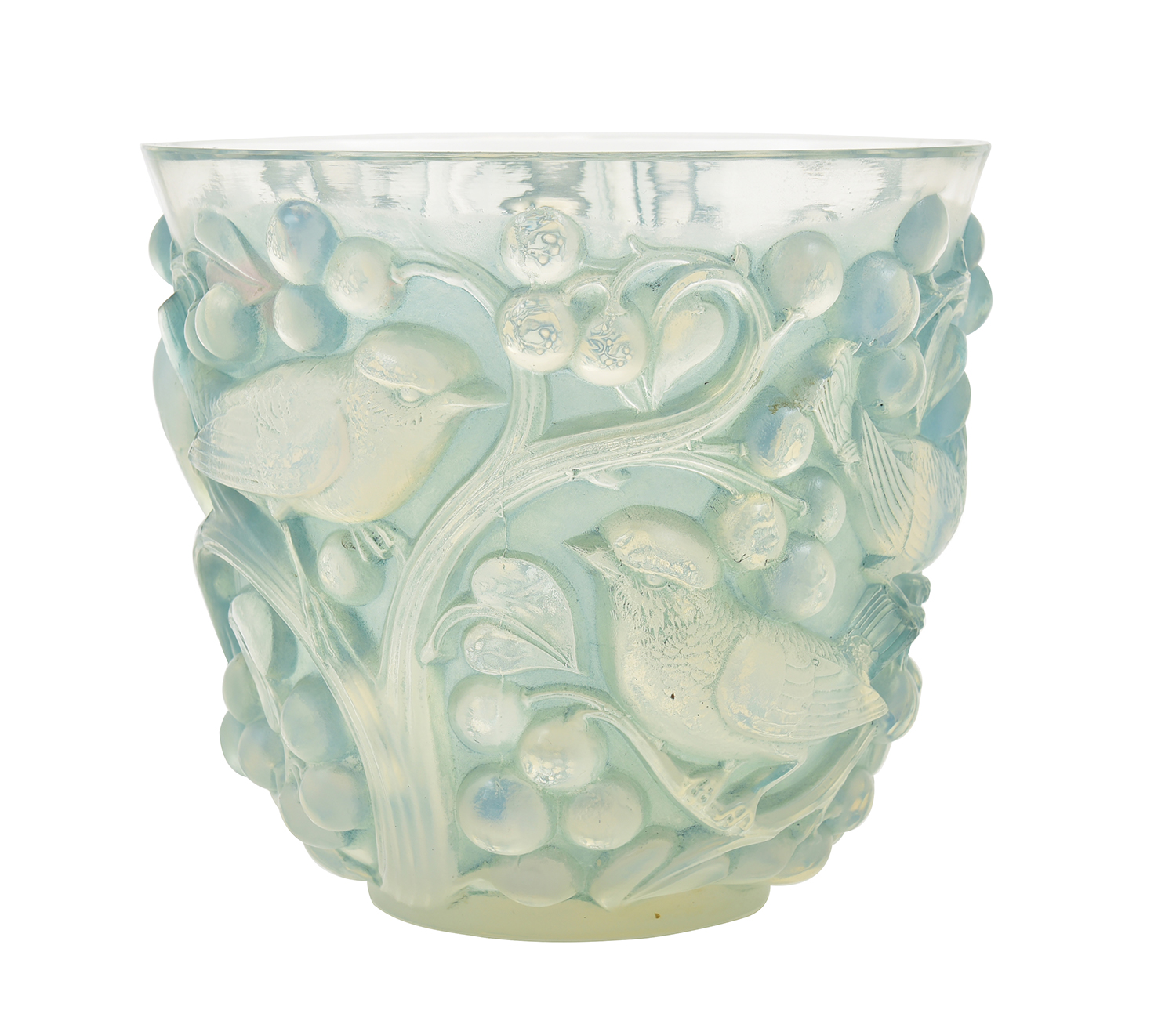 the tapering vase modelled with repeating sparrow and berry motifs, etched 'R. Lalique, France, N: 986' to base, 14.5 x 16cm diameter