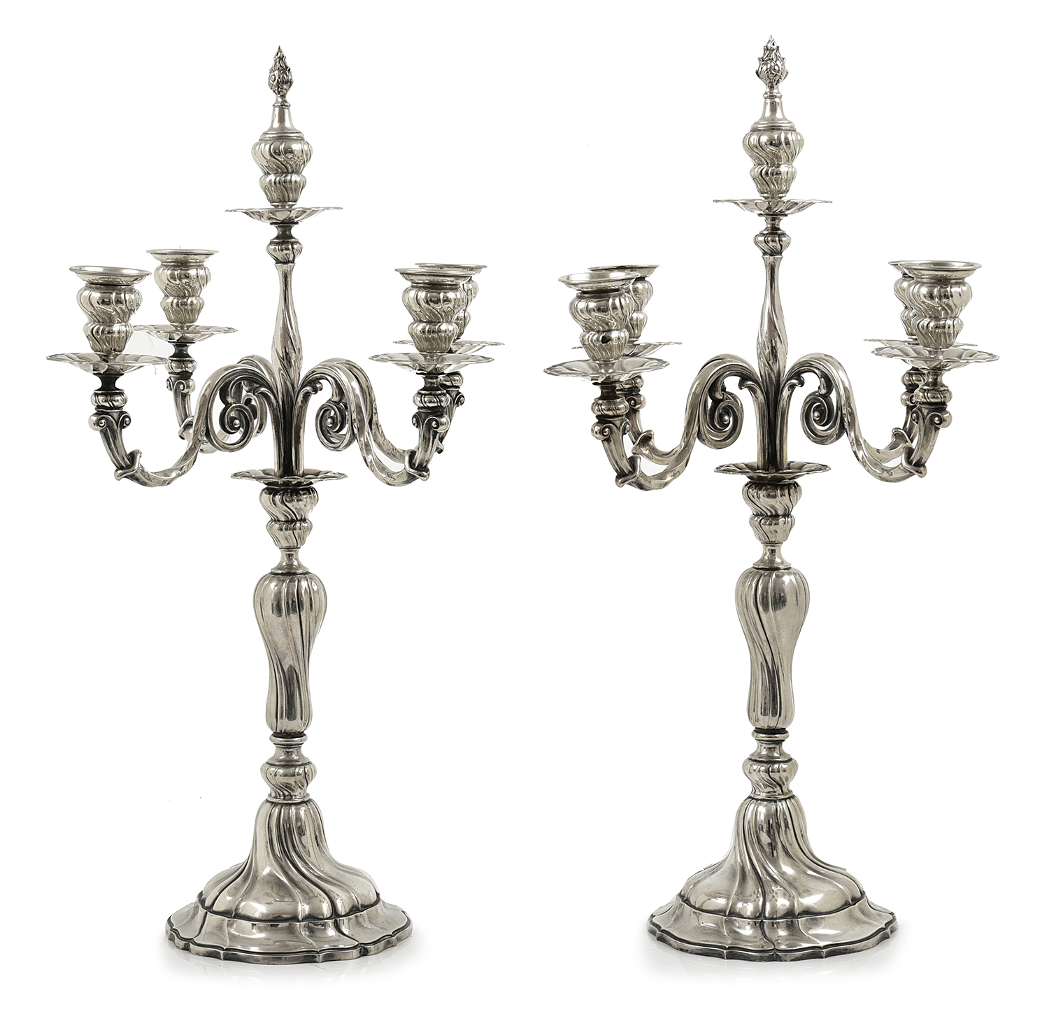 A PAIR OF LARGE GERMAN 800 SILVER FOUR BRANCH CANDELABRA