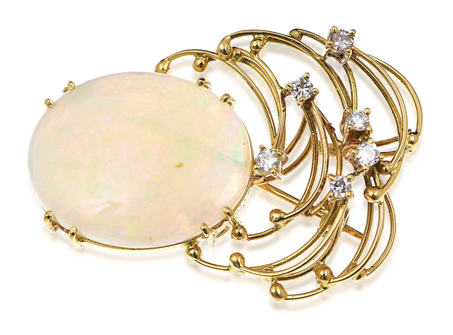 The oval solid white opal cut en cabochon, having a wirework surmount offset by six round brilliant cut diamonds, all mounted in 18ct gold.