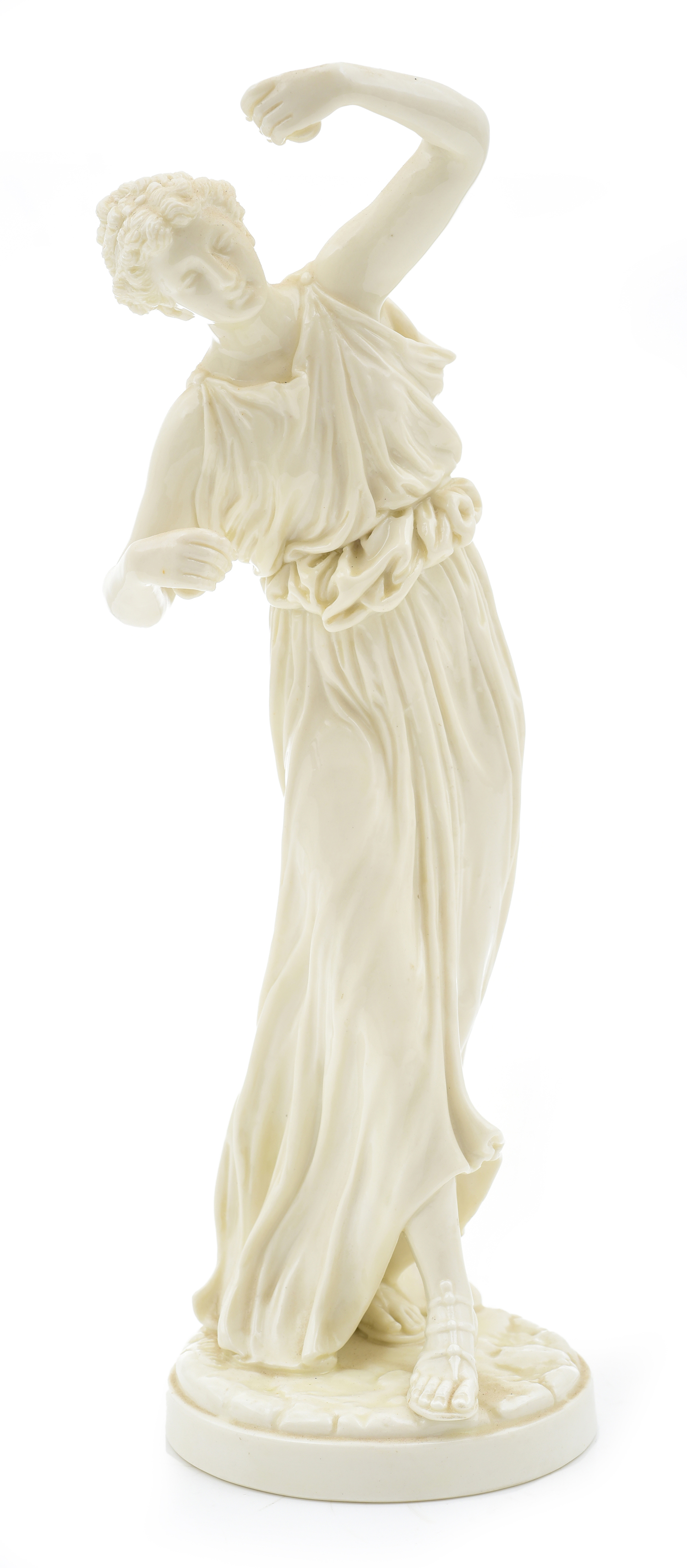 modelled wearing traditional robes holding small cymbals in each hand, brown factory mark to base faint, 30cm high