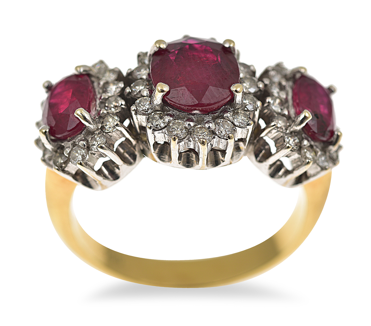 Comprising three clusters totalling 3.20cts, each centrally set with an oval cut ruby having round brilliant cut diamonds set to the surround, mounted in 18ct gold, ring size N.