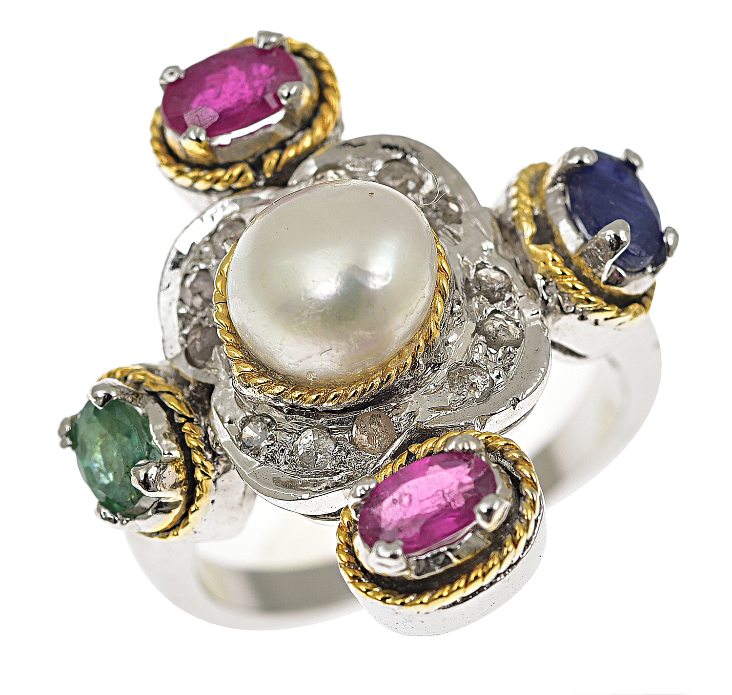 Of cross formation centrally set with a button pearl surrounded by old cut diamonds, finished with ruby, sapphire and emerald detail, mounted in silver, ring size M.