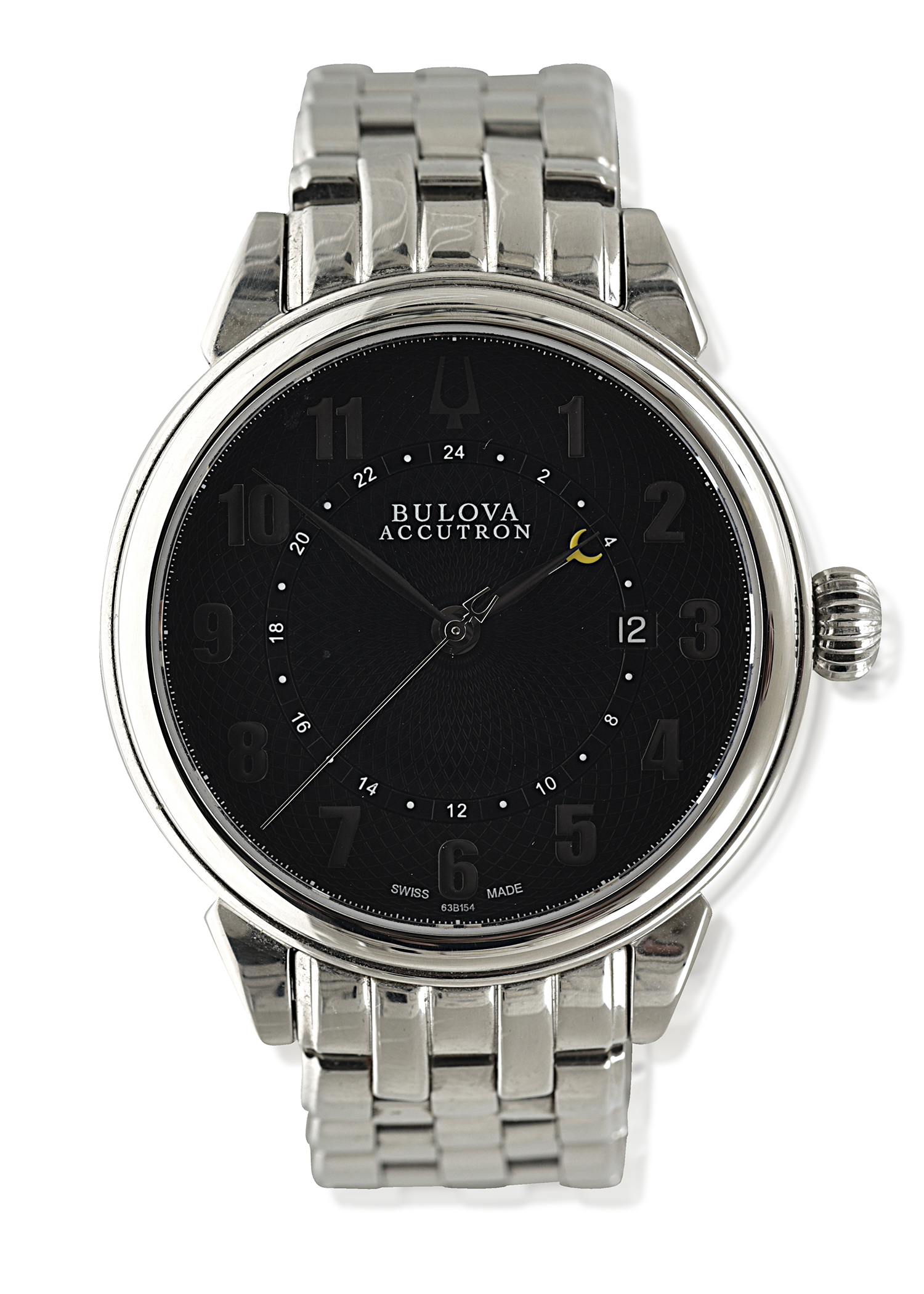 Automatic movement, circular black dial with silver Arabic numerals, twenty four hour inner dial, date aperture at three, signed case, dial and movement, stainless steel case with conforming bracelet bands, model number 63B154, 42mm diameter.