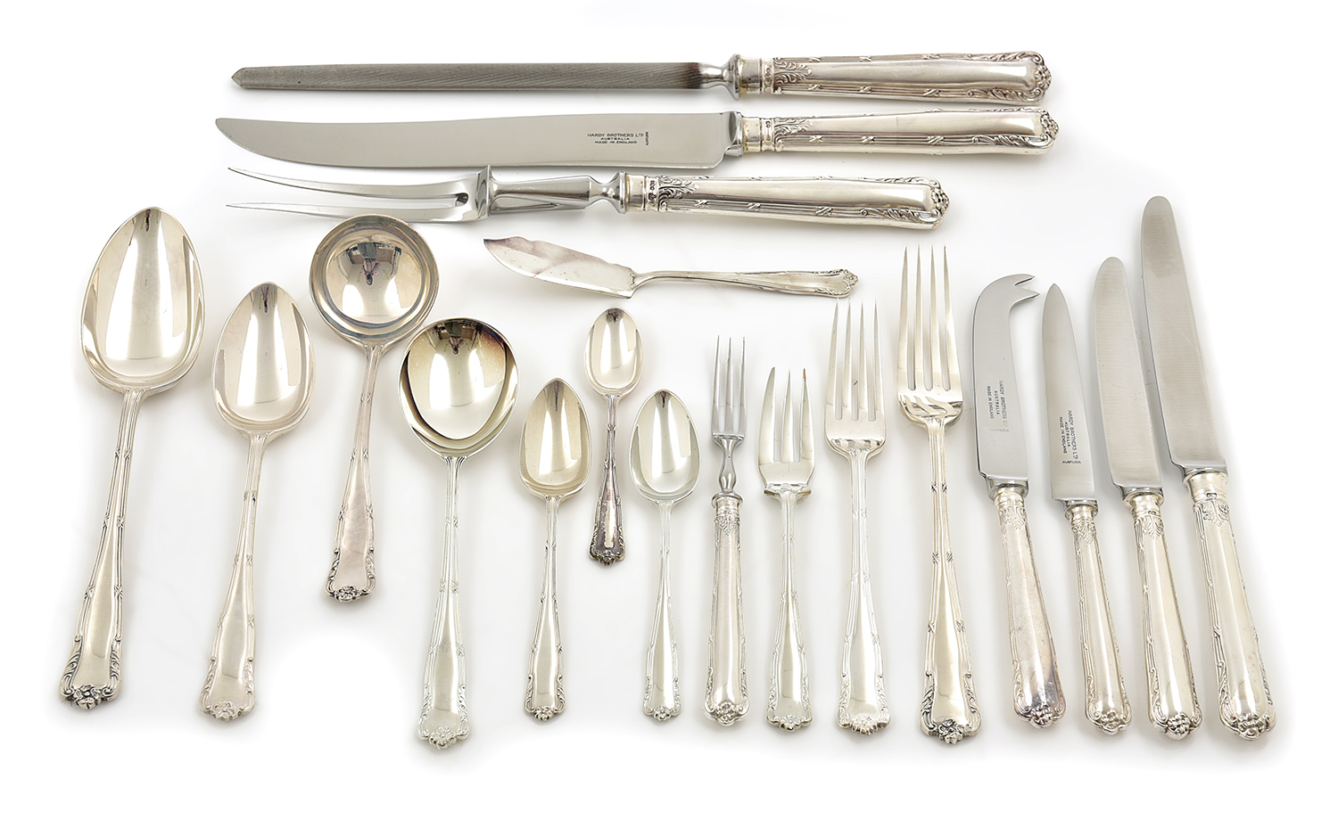 Comprising eight dinner knives, eight entree knives, eight dinner forks, eight entree forks, twelve dessert forks, four fruit forks, four fruit knives, six fish forks, six fish knives, four serving spoons, eight soup spoons, eight dessert spoons, seven teaspoons, one demi tasse spoon, one sauce ladle, one cheese knife, a small server, and a three piece carving set, total weight 4458 gms (98)