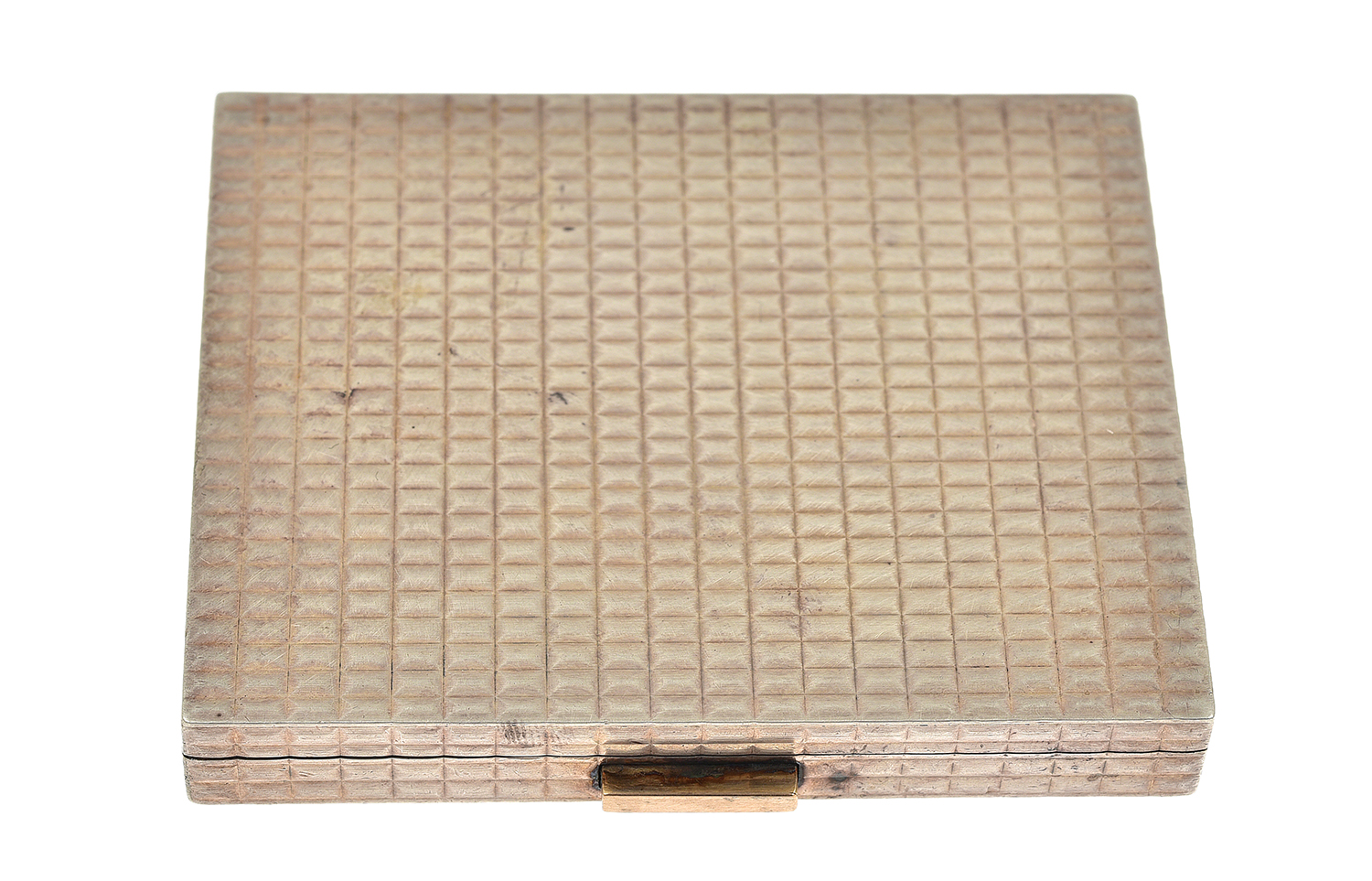 The rectangular hinged case with engine turned geometric decoration, having a mirror to the interior, signed Cartier Paris, 80mm x 65mm.