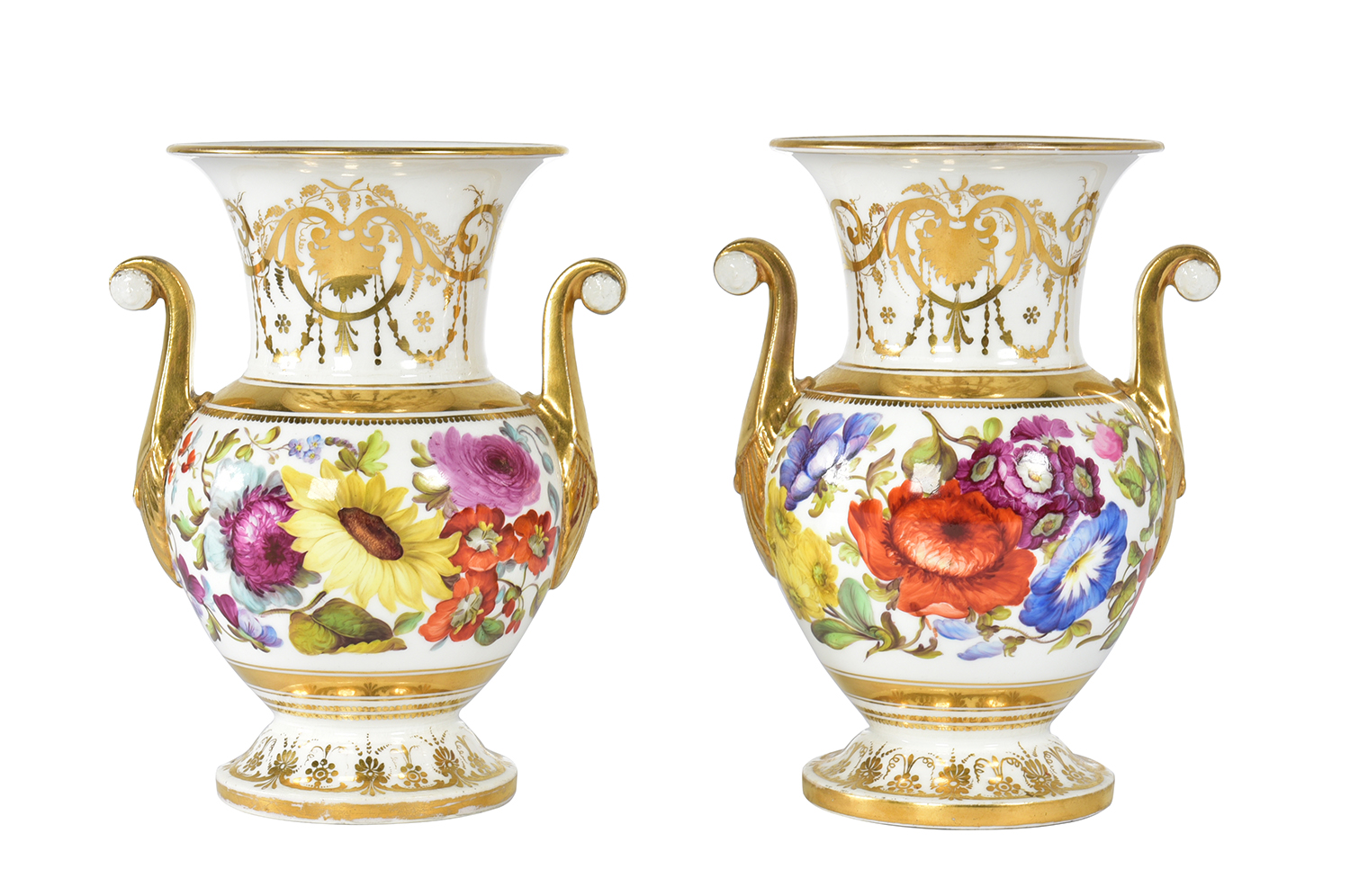 each vase with a floral design flanked by two Empire style handles, 18.5cm high