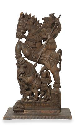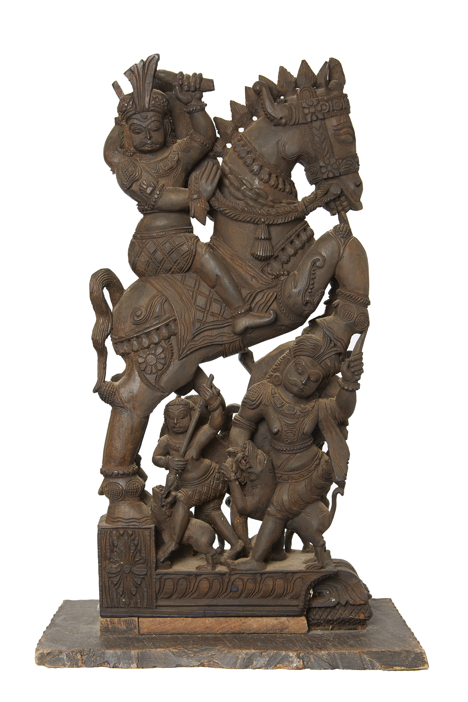 Depicting a Maharaja in battle on horseback, carved to both sides, 38 width x 13 depth x 79cm height (excluding base)