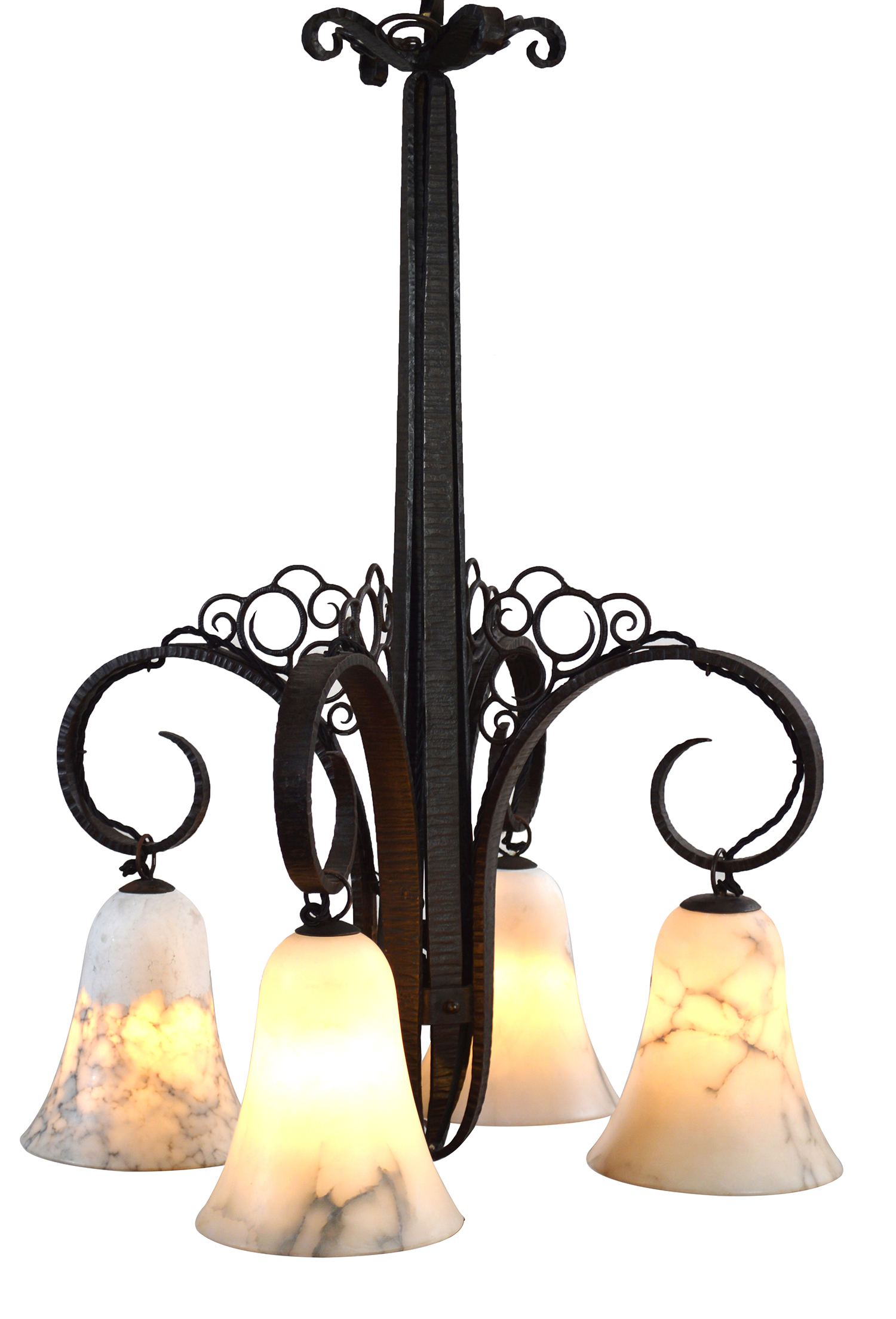 wrought iron structure with four alabaster bell shaped shades (shades repaired, one shade loose)