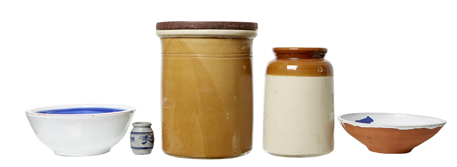 The two large jars with impressed numbers and marks, one with wooden cover, the small pot with blue painted decoration and two tin glazed bowls, 31, 25.5 and 8 high and 26cm diameter (5)