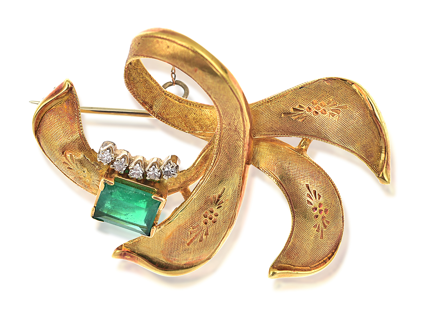 Modelled as stylised ribbons with chased decoration, offset by an emerald cut emerald of 0.80cts and five single cut diamonds, mounted in 18ct gold.