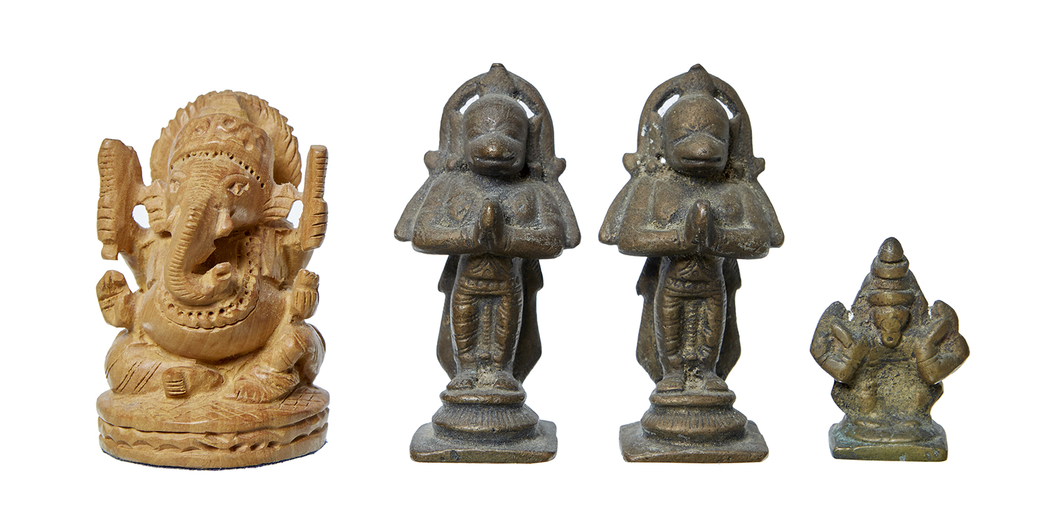 Comprising pair of Narasiha figures and Ganesh in bronze and boxwood tallest 7cm (4)