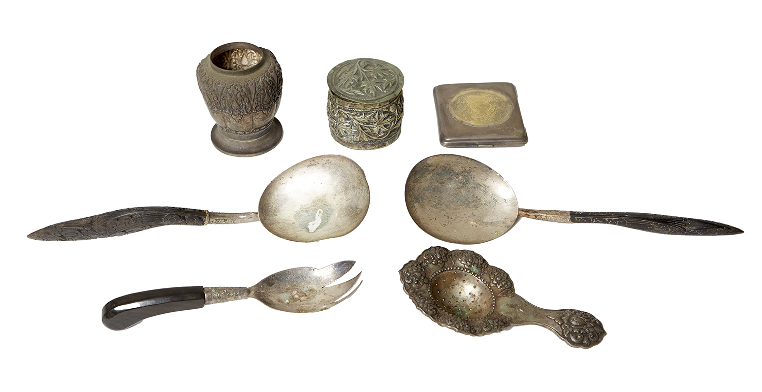 Comprising Yogya 800 Delux marked bowl and strainer, unmarked cigarette case box and servers (7)