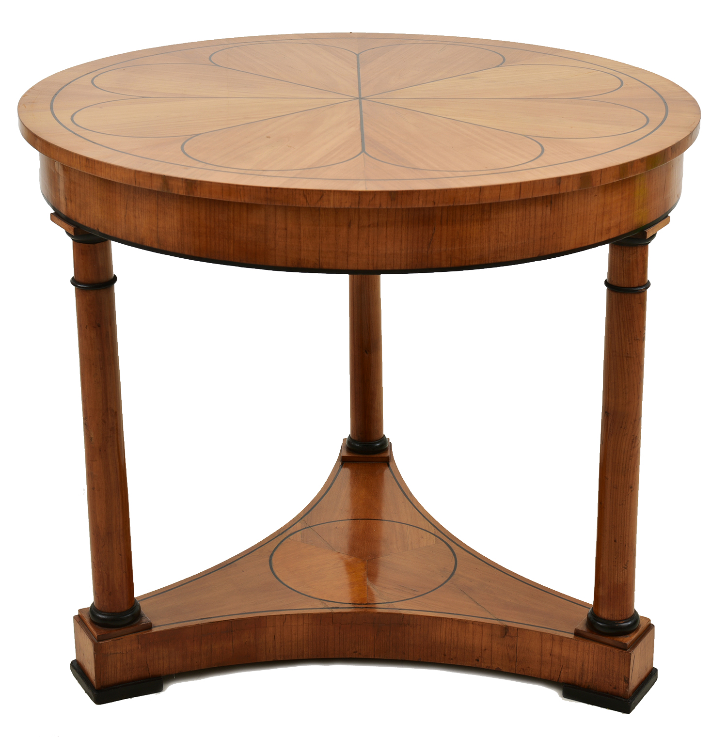 the circular table top inset with ebony string inlay in a rosette design, supported by a three columns joining to a tripartite pedestal base, 69cm x 90cm diameter
