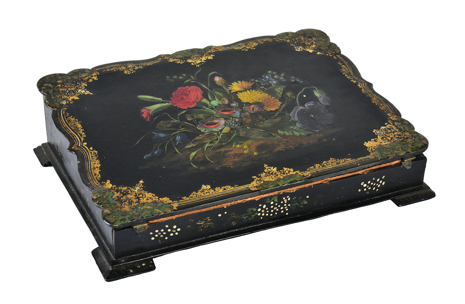 A VICTORIAN PAINTED AND MOTHER OF PEARL INLAID PAPIER MACHE WRITING COMPENDIUM