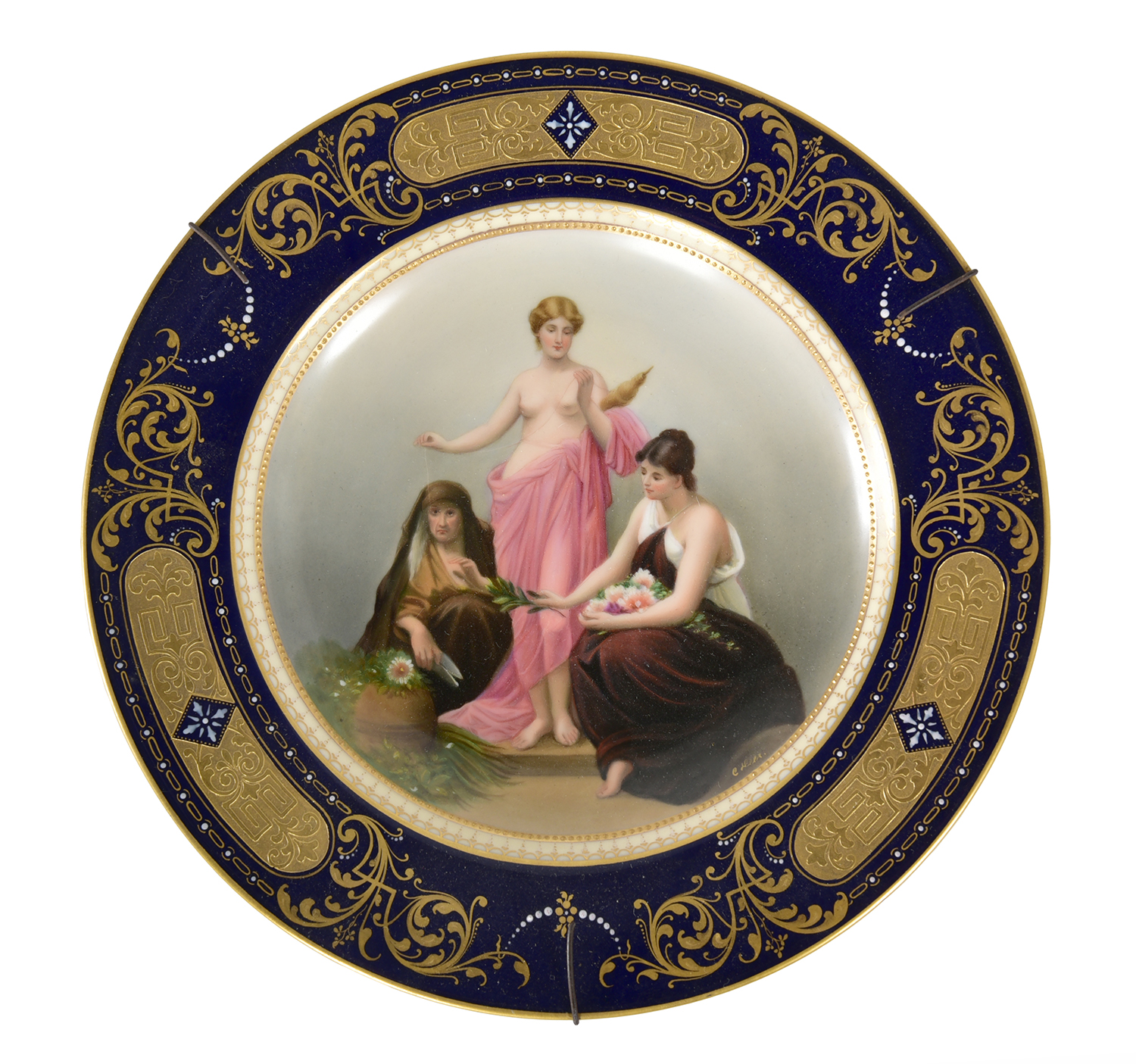 painted with an allegorical scene depicting three Classically draped females representing the three fates, reserved on a cobalt blue border, with embossed gilt and enamelled highlights, underglaze blue mark and partial title verso, 24cm diameter