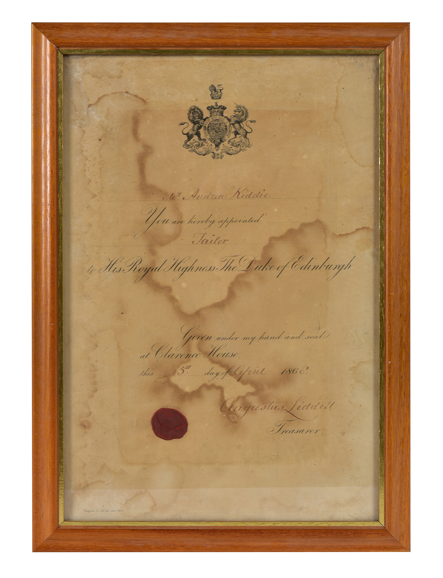 inscribed 'Mr Andrew Kiddie / You are hereby appointed / Tailor / to His Royal Highness The Duke of Edinburgh / Given under my hand and seal / at Clarence House / this 15th day of April 1868 / Augustus Liddell / Treasurer', (evidence of water damage, mildew and yellowing throughout), 39.5 x 27cm