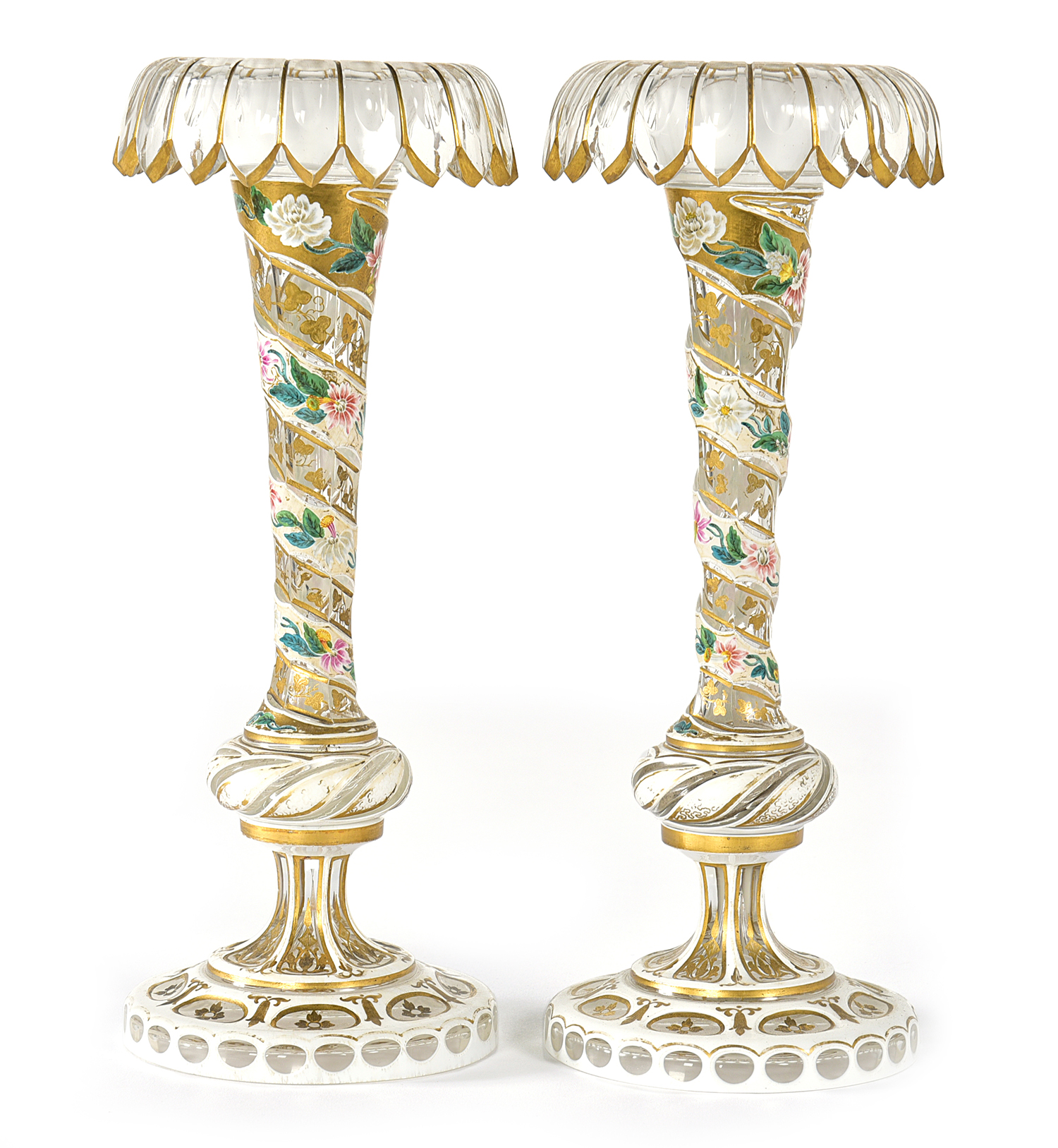 A PAIR OF 19TH CENTURY BOHEMIAN PAINTED AND OVERLAID CLEAR GLASS VASES