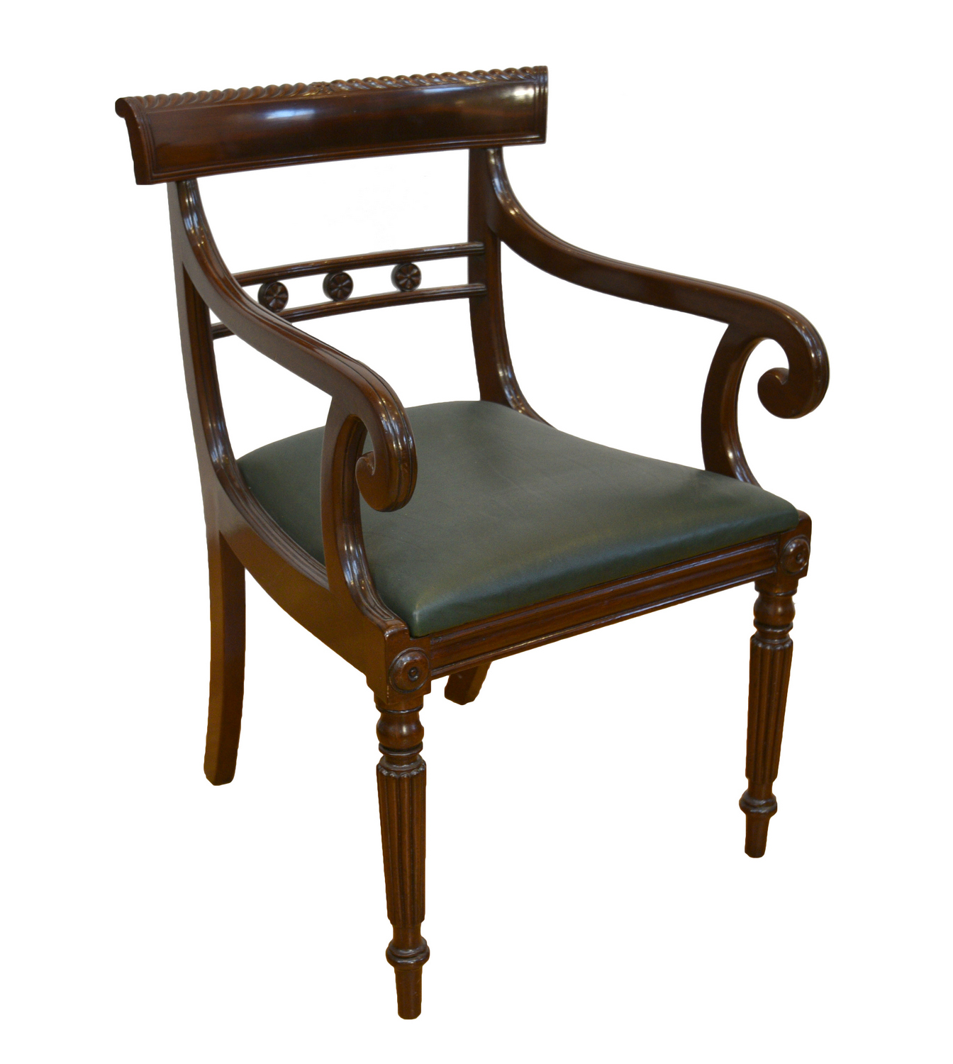 with a feather carved spade back, above a pierced horizontal splat, bugle arms and a green leather upholstered drop-in seat, fluted front legs