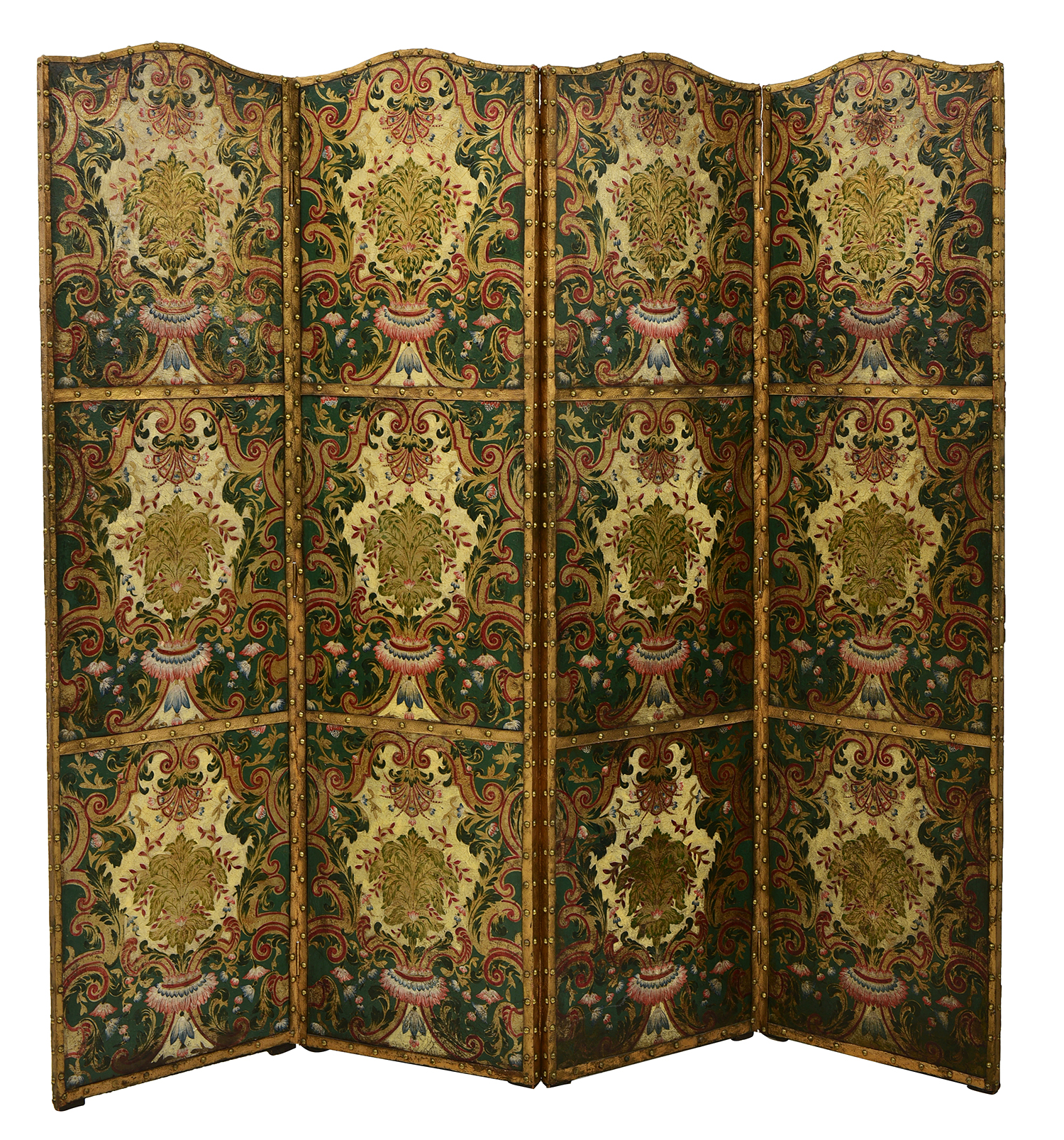 the ebonized frame inset with a leather panel and brass stud detail, each panel with three hand painted reserves of flowers , 193 x 51cm