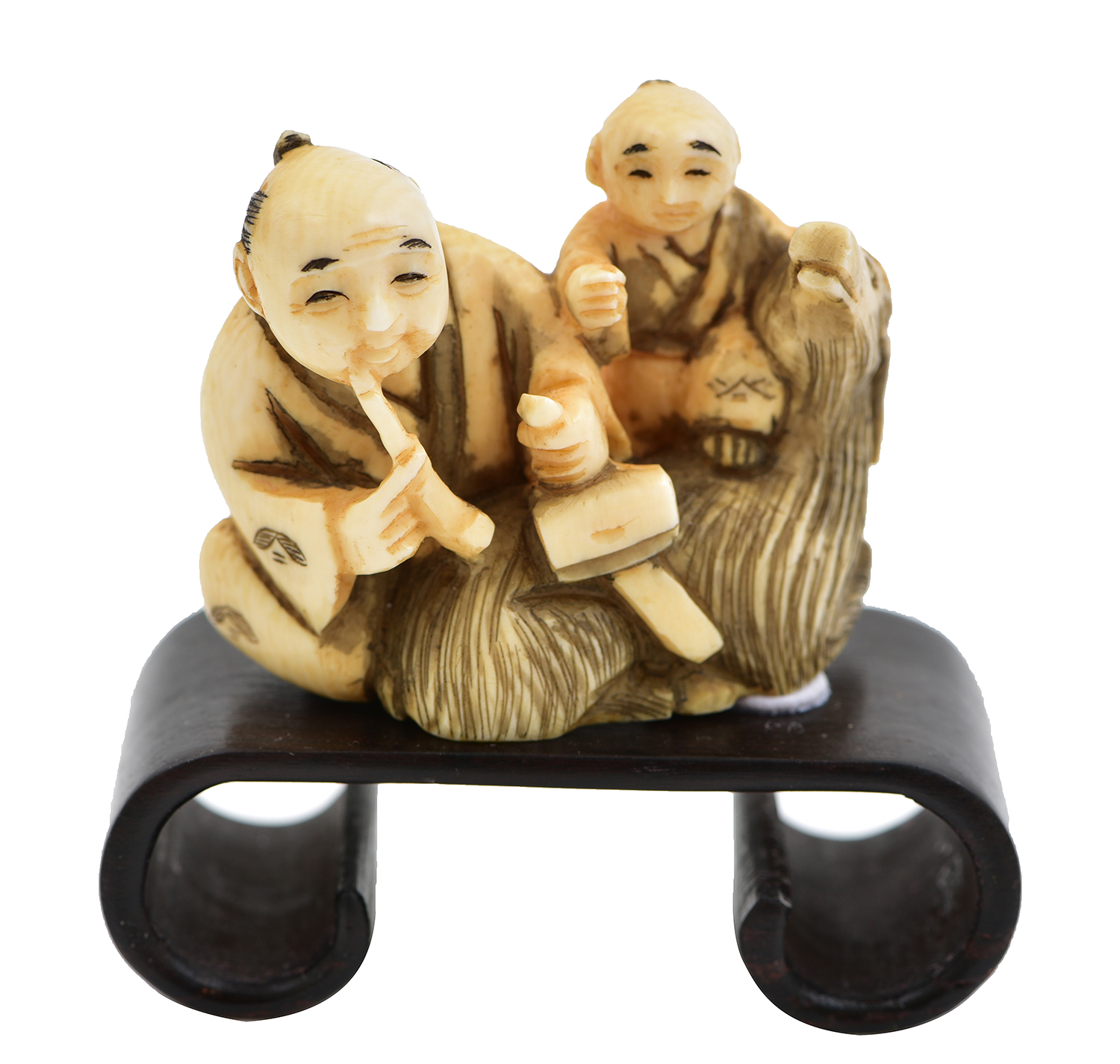 modelled as a father, son and a deer, signed Kazuyuki Isshi, housed on stand, the netsuke 4.5 x 5cm, the stand 2 x 6cm