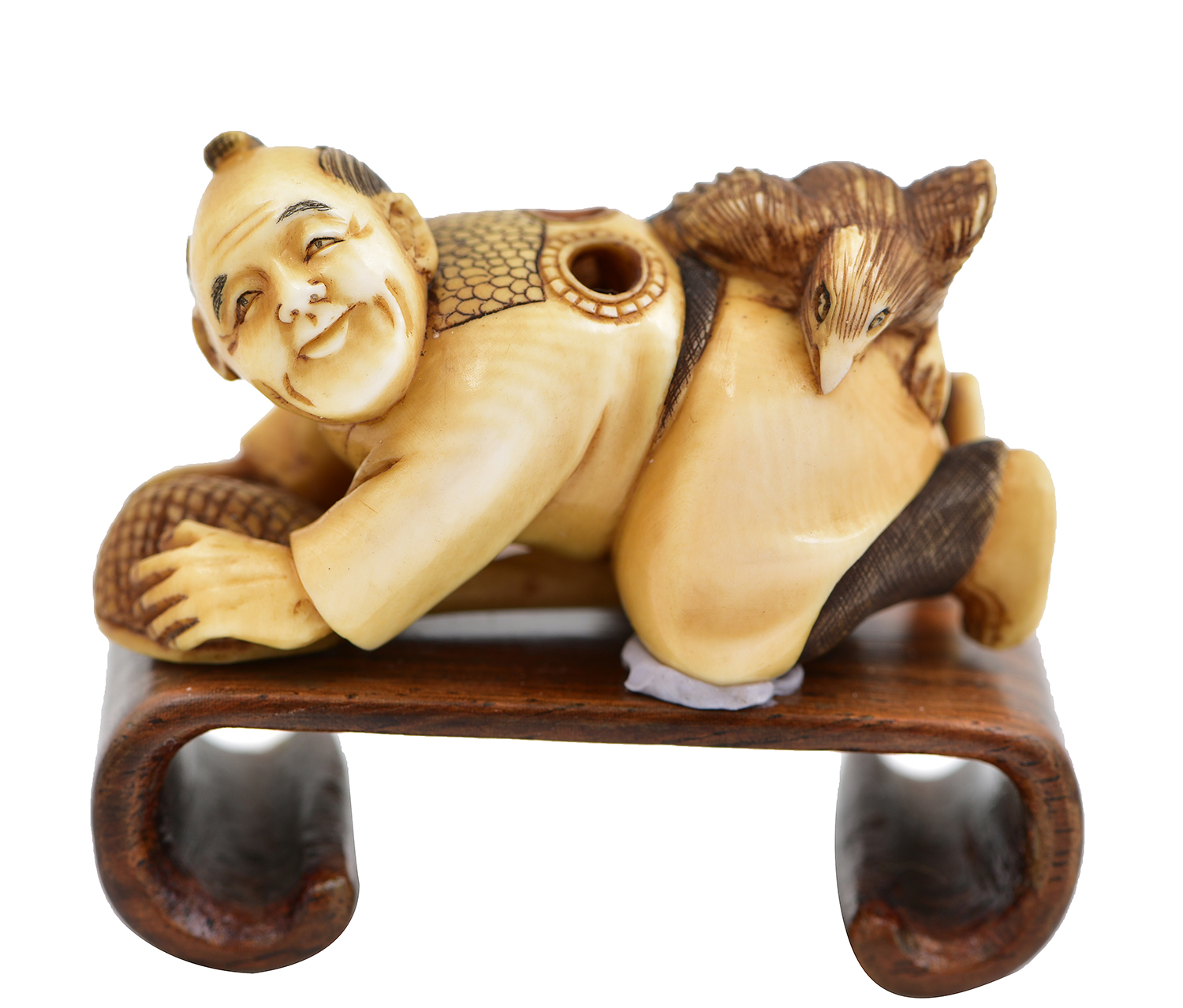 modelled as a man attempting to catch a suzume, signed 'Nanita', housed on stand, the netsuke 2 x 4.5cm, the stand 1.5 x 4.5cm