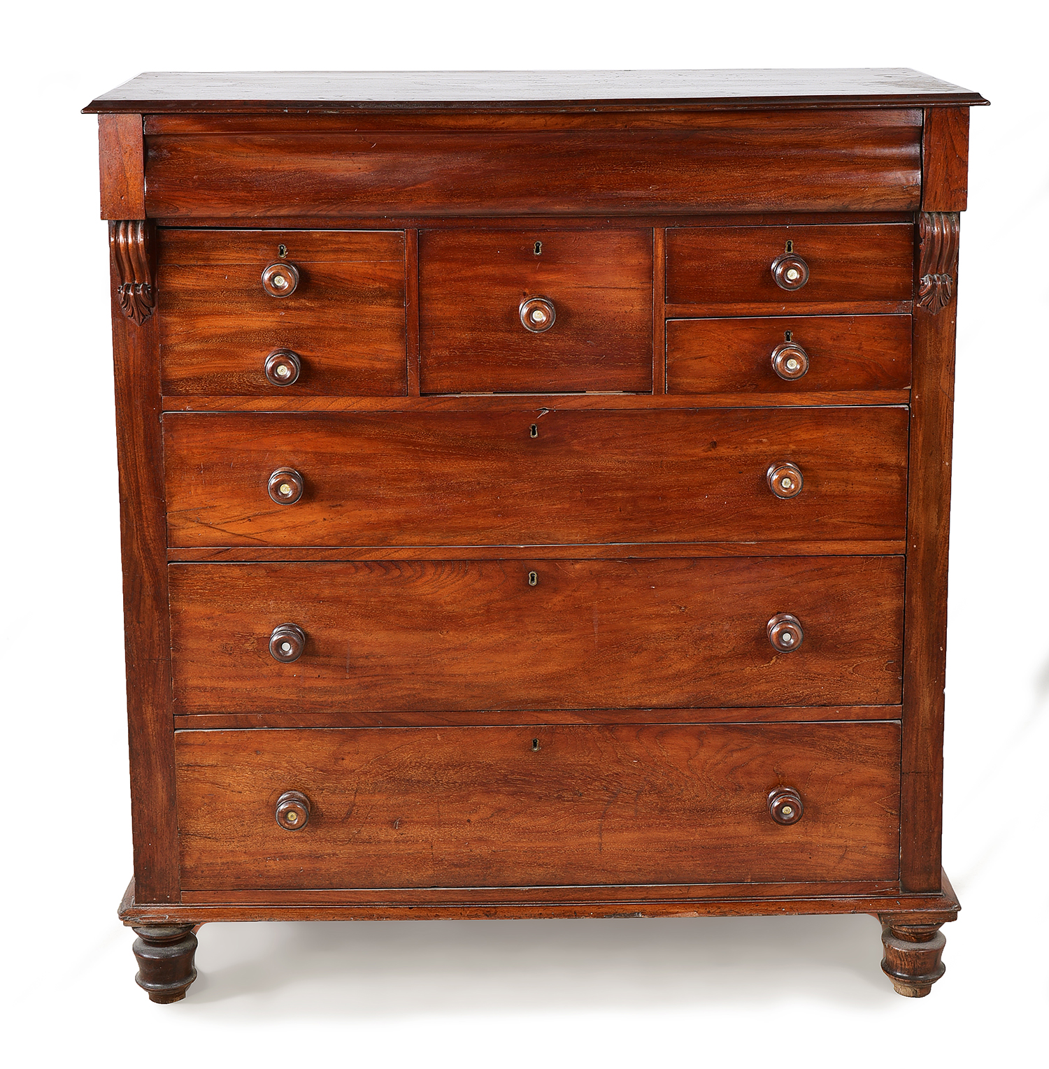 rectangular, with five irregular drawers above three larger drawers, on four bun feet,134 x 123 x 50cm