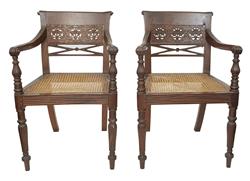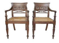 Each with caned seat, the curved top rail with scroll ends, the back splat with open carved floral roundels, the reeded scroll arms on baluster and turned supports