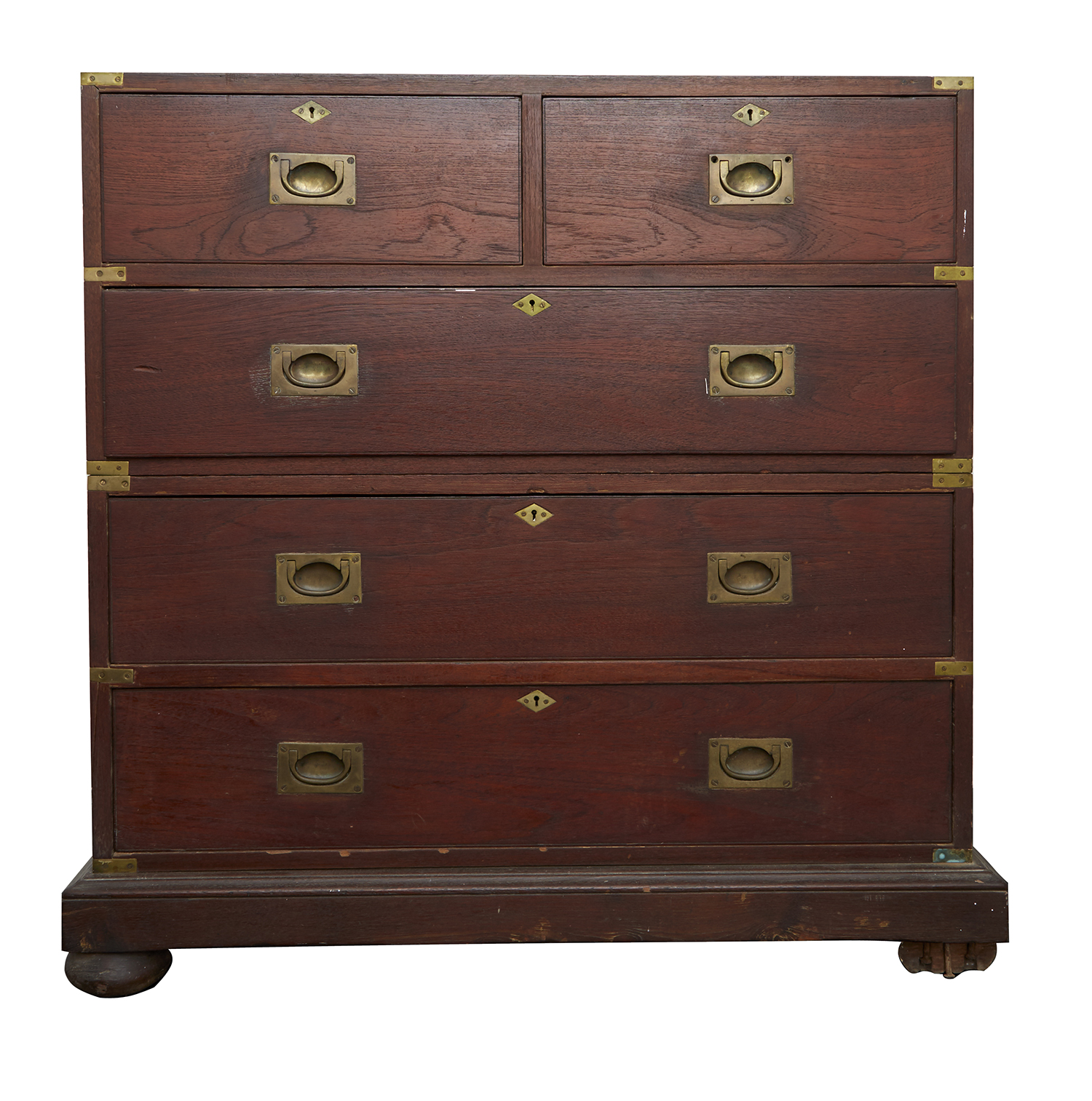 With two stages, brass fittings and carry handles, two short above three long drawers, on bun feet, 106 width x 55 depth x 110cm height