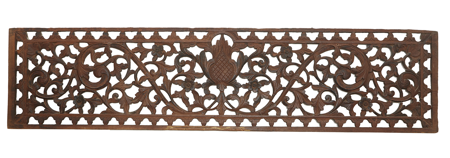 With central anthemion within flourishing baroque feather scrolling, 171 width x 40.5cm height