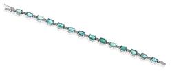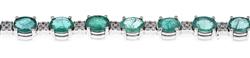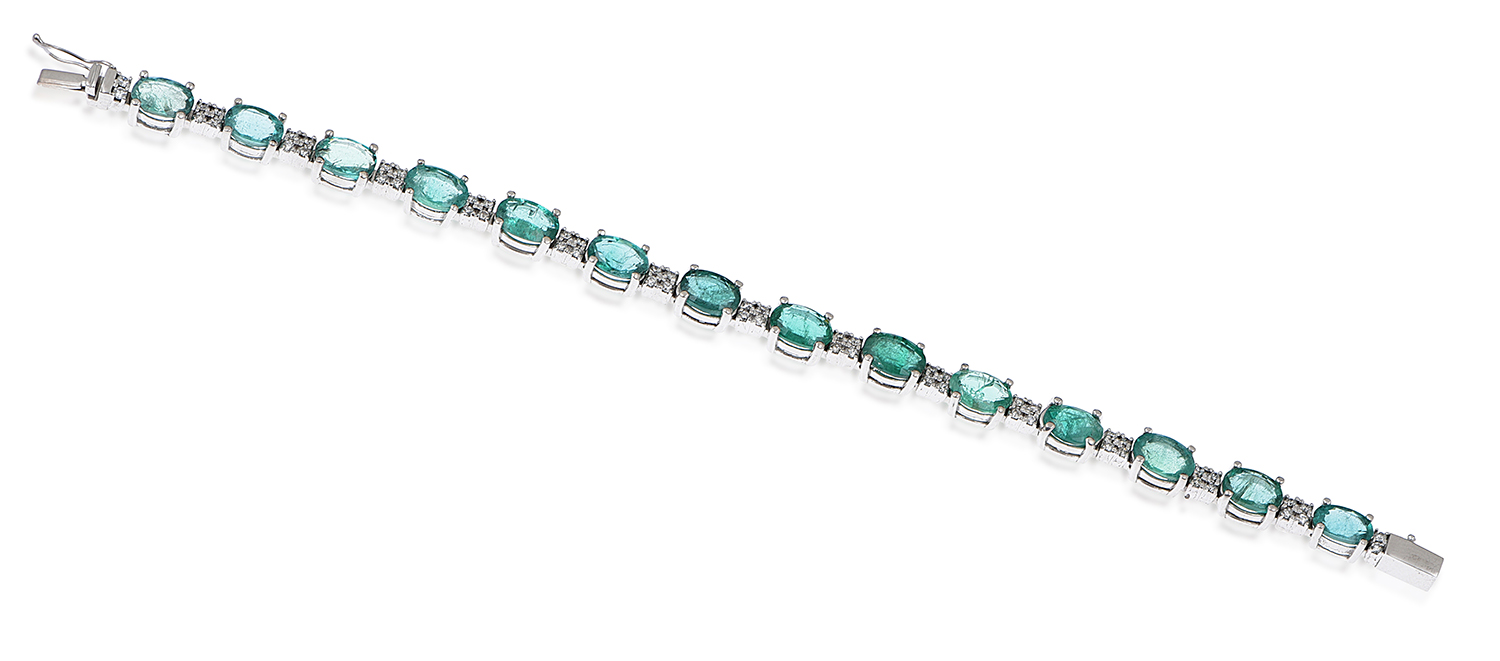 Comprising fourteen oval cut emeralds, each interspaced by a square panel set with four round brilliant cut diamonds, mounted in 18ct white gold, total length 180mm.