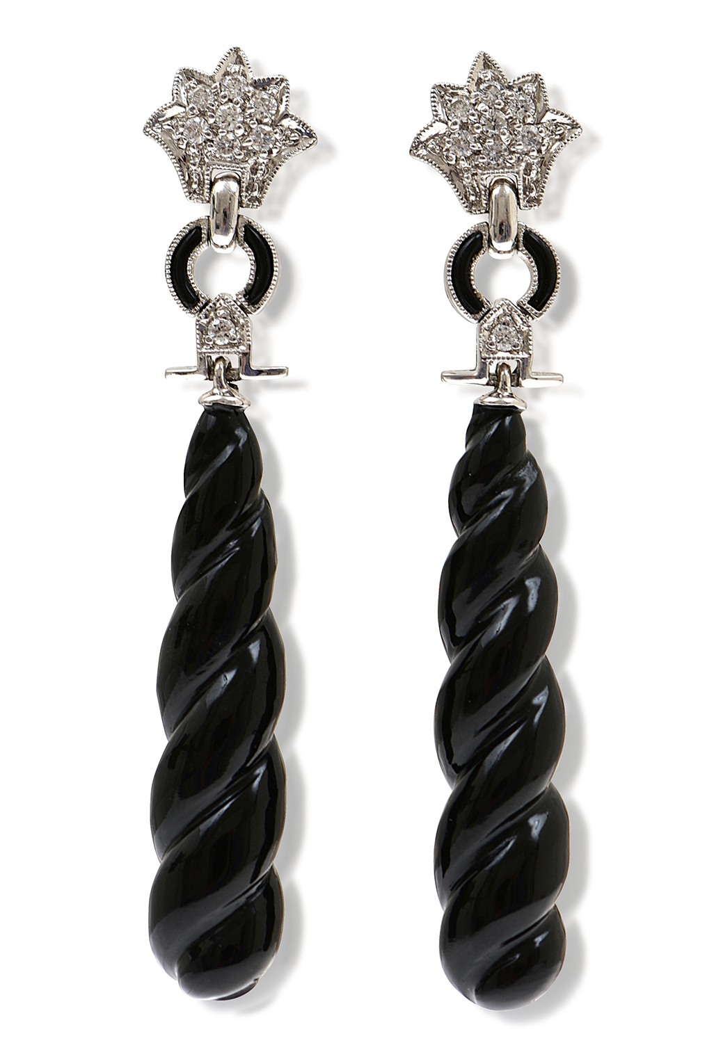 Each having an elongated drop of barley twist onyx, surmounted by pierced geometric panels set with round brilliant cut diamonds and onyx, all mounted in 18ct white gold.