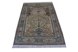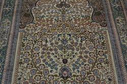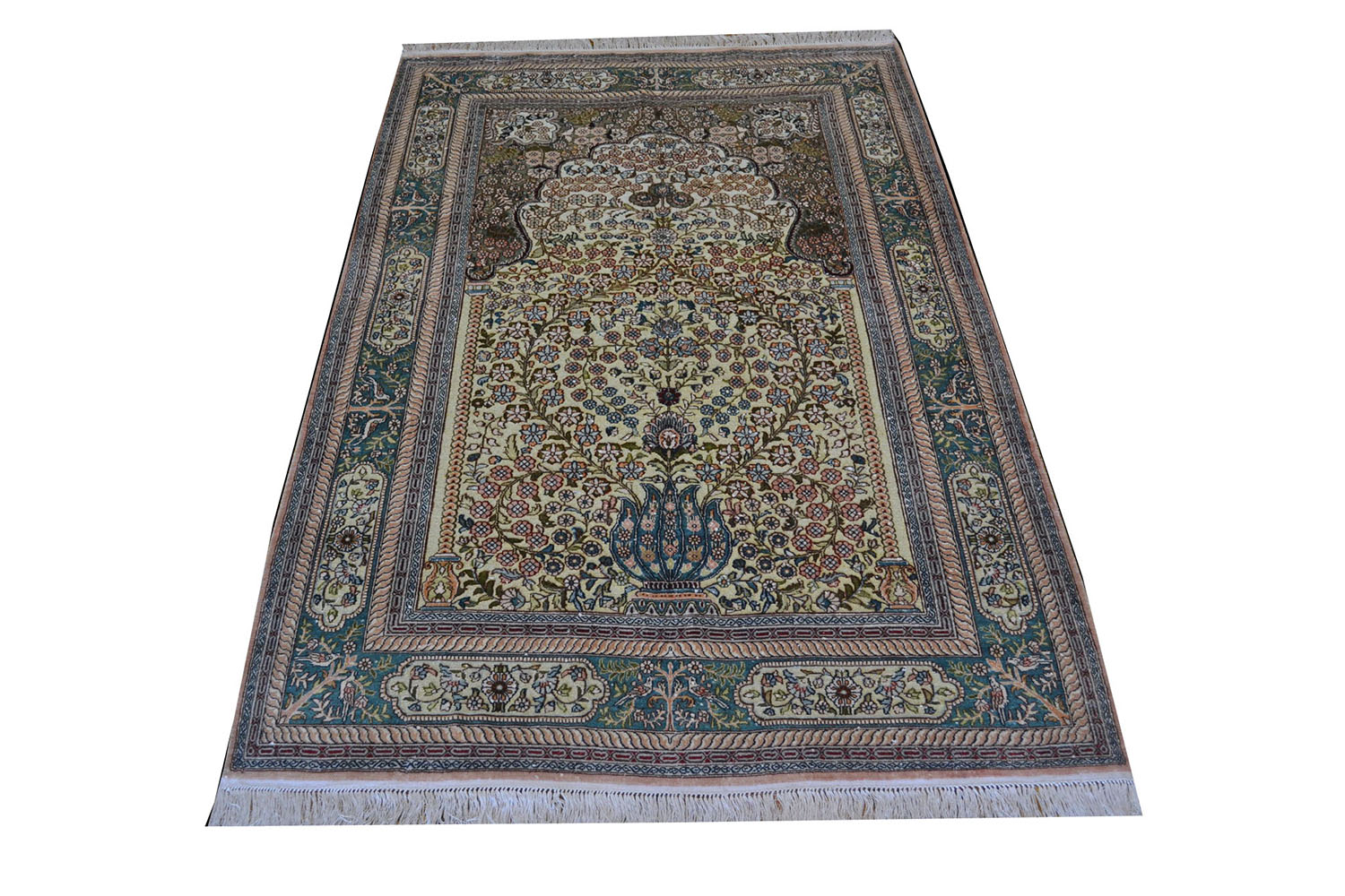 this piece was specially woven for the royal family, this fine piece is silk woven and has Anchor Artiste Metallic gold used in the backdrop, the temple design is set on a green ground, approximately 900000 knots Per SQ Meters, 187x125cm