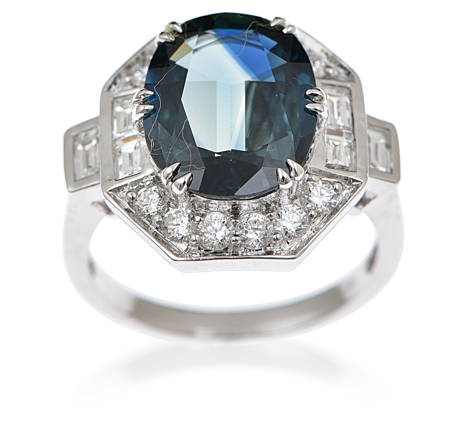 The octagonal panel centrally set with an oval cut parti-sapphire of 4.70cts, with baguette and round brilliant cut diamond detail throughout, mounted in 18ct white gold, ring size M-N.