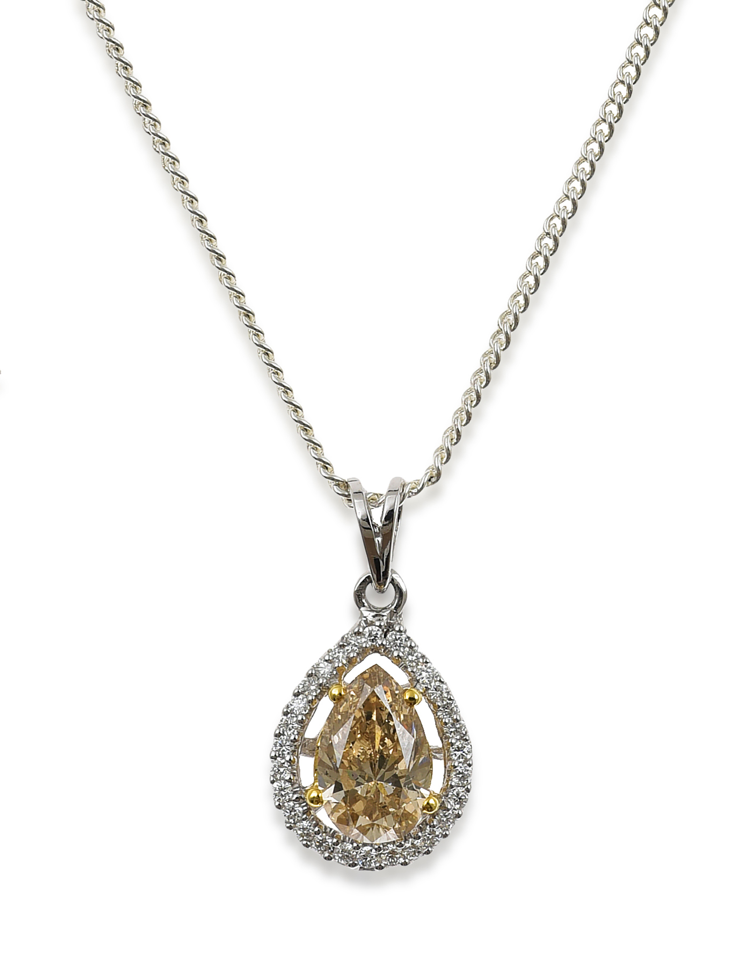 The pear cut cognac diamond of 2.01cts, surrounded by white brilliant cut diamonds, mounted in 18ct white gold.
