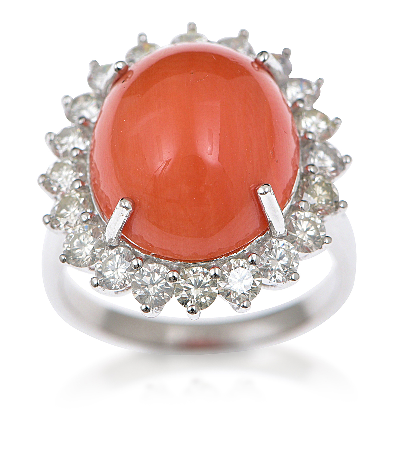 The oval coral cut en cabochon surrounded by twenty round brilliant cut diamonds totalling 1.40cts, mounted in 18ct white gold, ring size O.