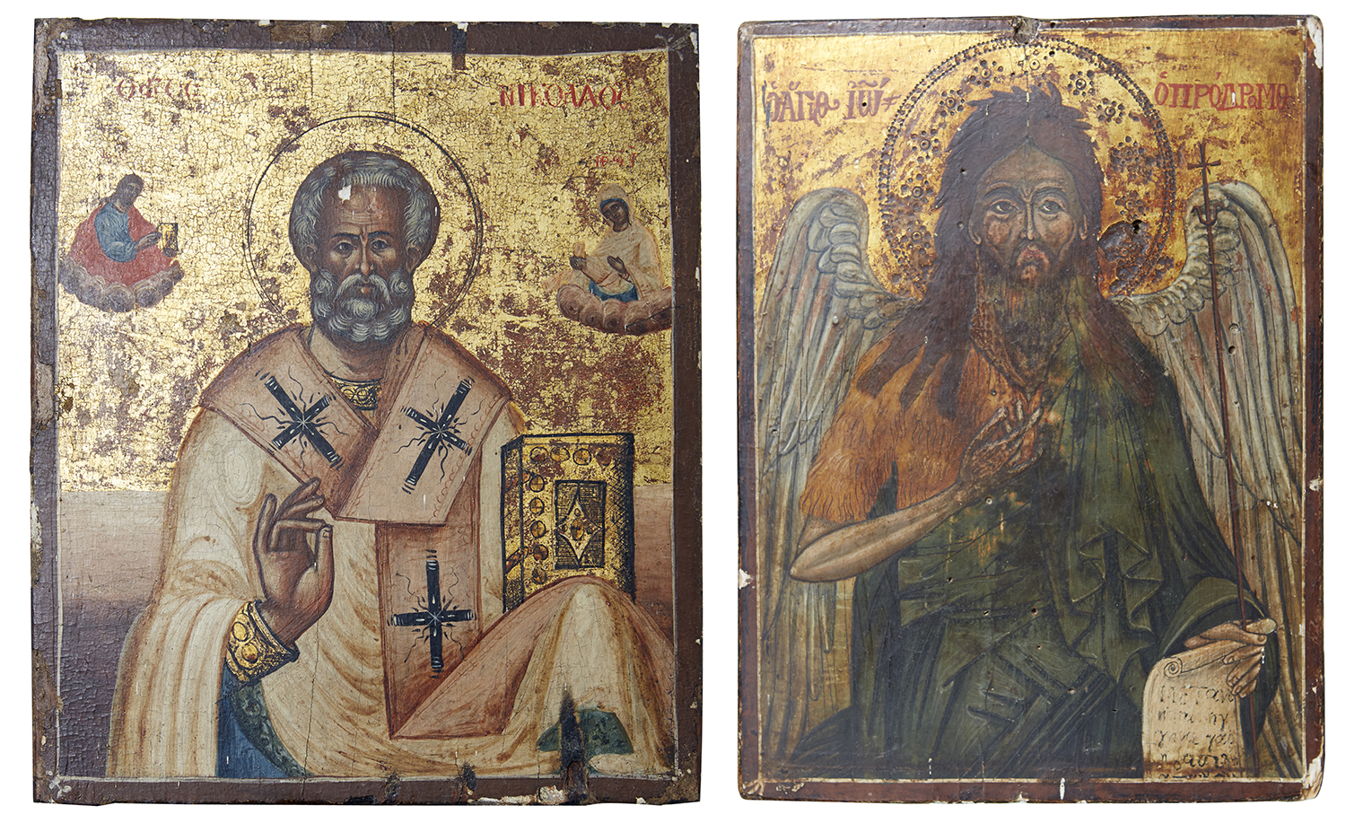 Depicting Old St Nicholas with white hair, gilded on red ground, dressed as a bishop holding the book of the Gospels and a blessing gestural with the fingers spelling IC XC (Jesus Christ), his head flanked by subsidiary figures of Christ and Mary, with Cyrillic inscriptions, 37 x 32cm