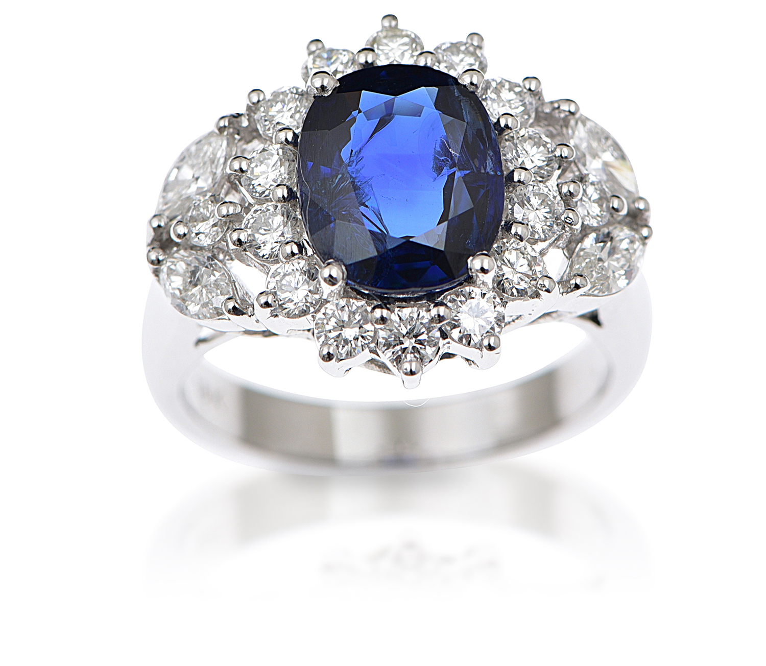 Centrally set with an oval cut sapphire of 2.40cts, surrounded and shouldered by marquise and round brilliant cut diamonds, mounted in 18ct white gold, ring size L.