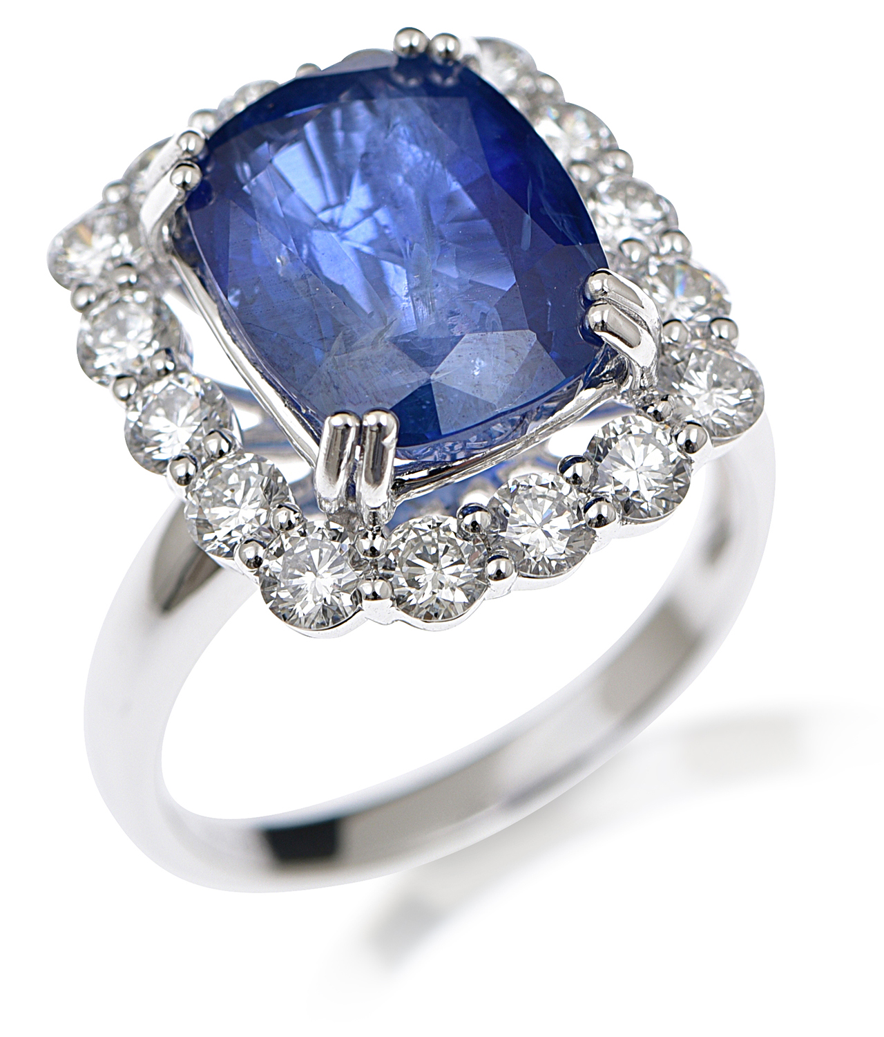 Centrally set with a cushion cut sapphire of 5.20cts, surrounded by round brilliant cut diamonds totalling 1.12cts, mounted in 18ct white gold, ring size M.